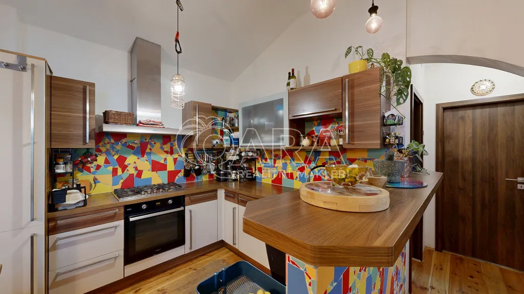 Ručně vyráběné mozaiky v kuchyni i na parapetech, práce se dřevem, krbová kamna, promyšlené detaily, které nepůsobí okázale, ale přirozeně. Velkorysá knihovna, chytré úložné prostory, světlo proudící do dvorního ticha – všechno dohromady vytváří harmonii, která se dnes hledá jen těžko.