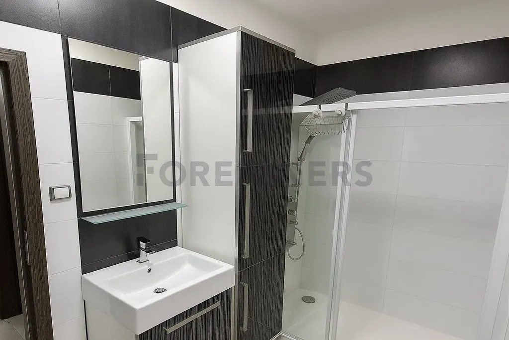 V koupelně se nachází sprchový kout, toaleta, umyvadlo, skříňka a pračka!