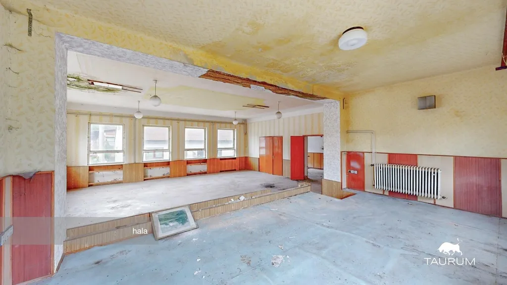 > 1. NP – 254 m² užitné plochy (v minulosti využíváno jako hospoda, sál s pódiem, toalety pro muže/ženy)