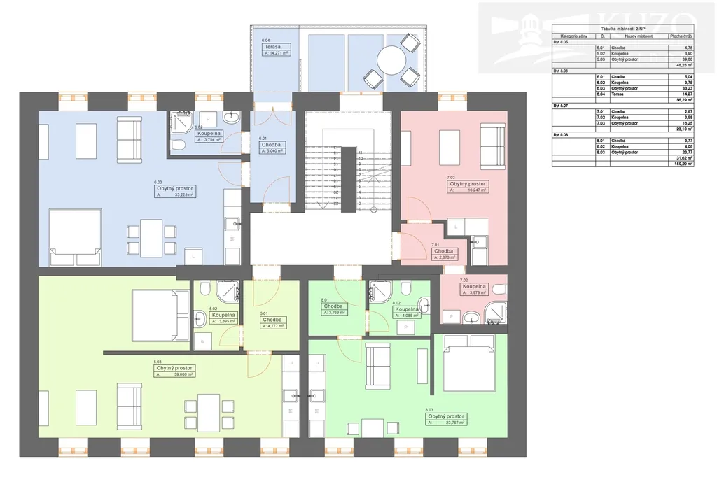 (K dispozici také sousední byt č. 6 s terasou, přízemní 1+kk a stylová podkroví s trámy ve 3. NP).