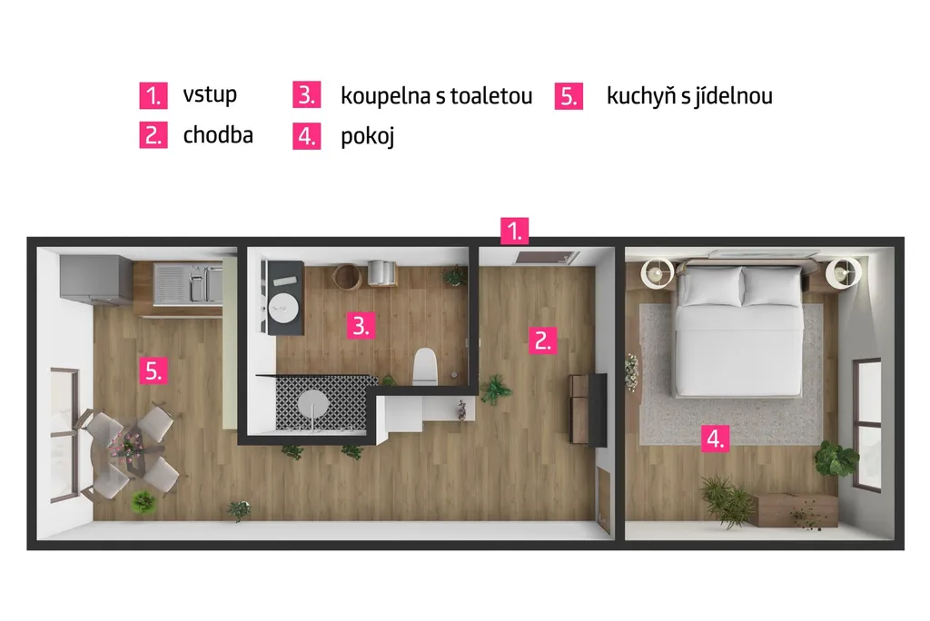 Jednotka disponuje samostatnou ložnicí, oddělenou kuchyní s jídelním koutem a koupelnou se sprchovým koutem a WC. Díky praktickému uspořádání nabízí pohodlné bydlení pro jednotlivce nebo pár. Jednotka je částečně vybavená a připravená k okamžitému nastěhování.