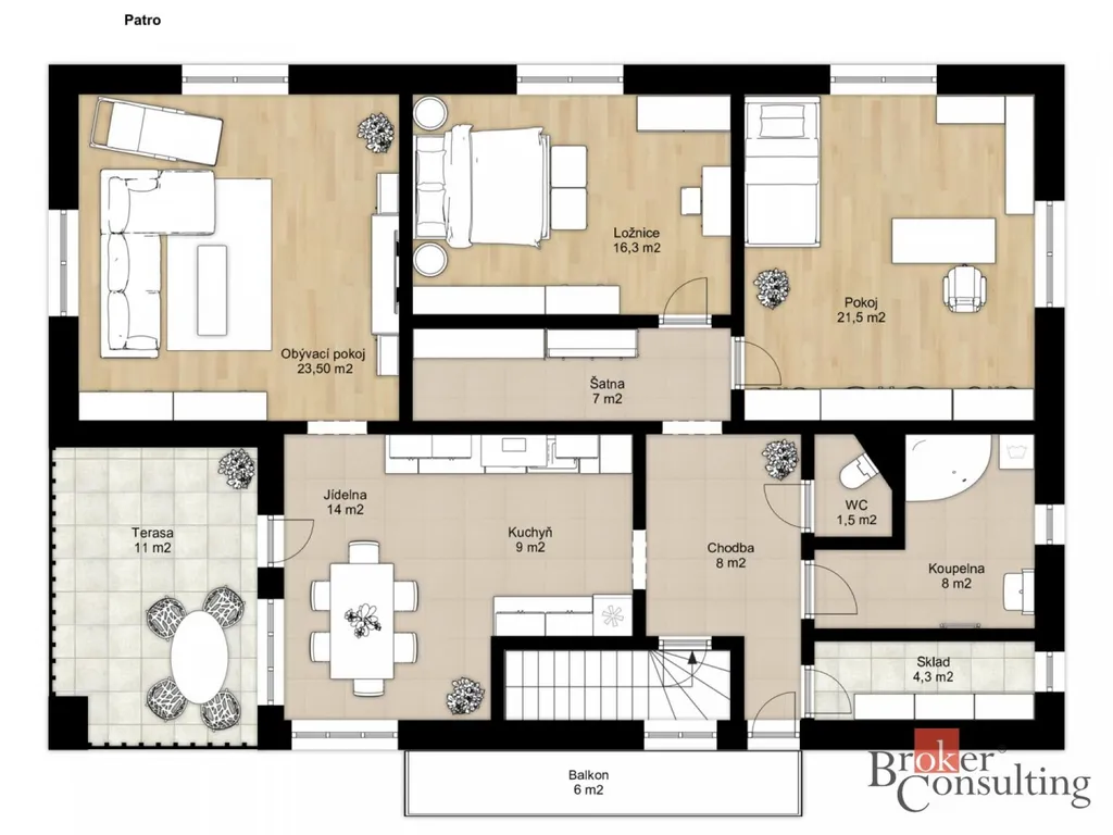 a přímý vstup na krytou terasu s 11m2 i balkon s 5m2.