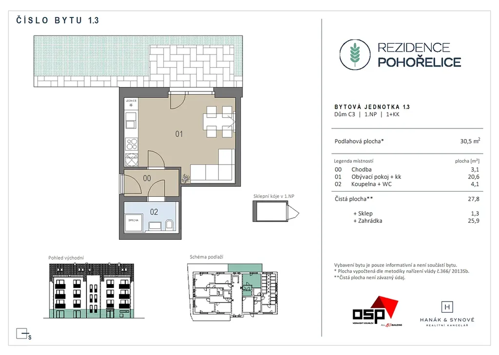K dlouhodobému pronájmu Vám nabízíme zcela nový, krásný, světlý, moderní byt v OV 1+kk v novostavbě bytového domu C3 Rezidence Pohořelice, na ulici U Kasáren. Byt o ploše 30,5 m2 s terasou (25,9 m2) je umístěn ve 1.NP čtyřpodlažního domu s velkorysými společnými prostory s výtahem.