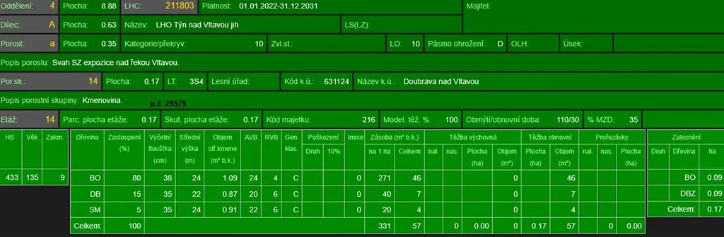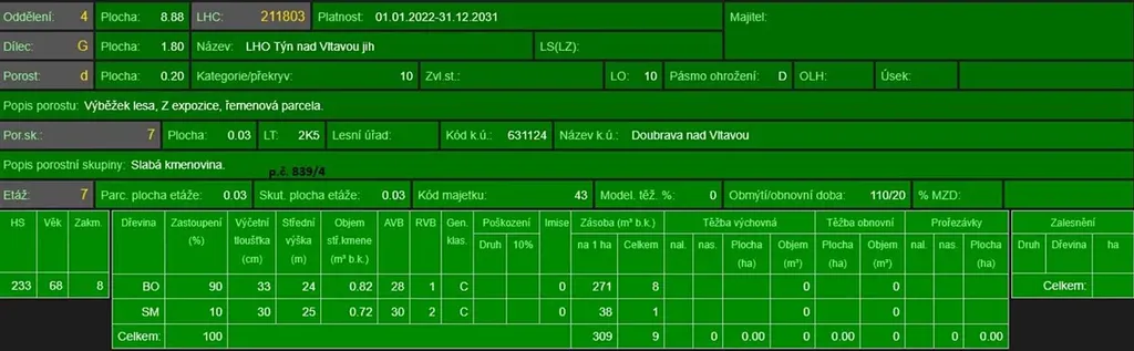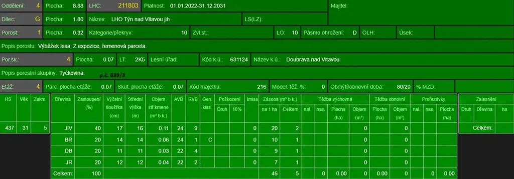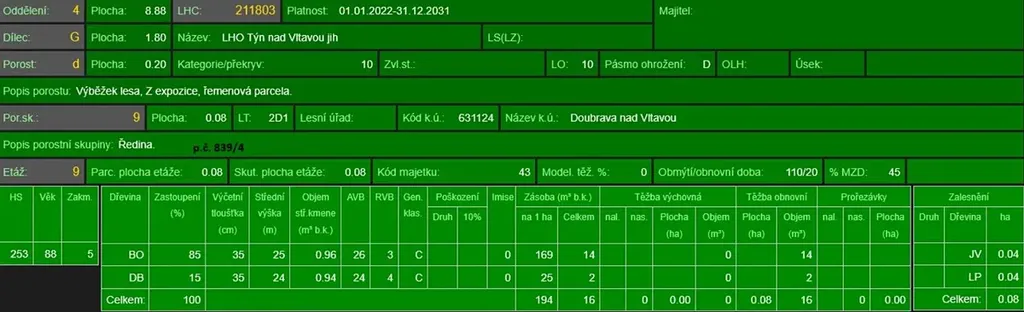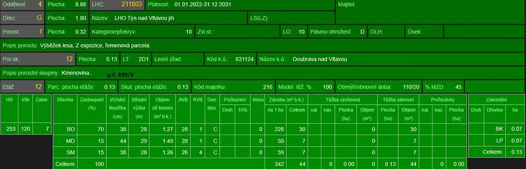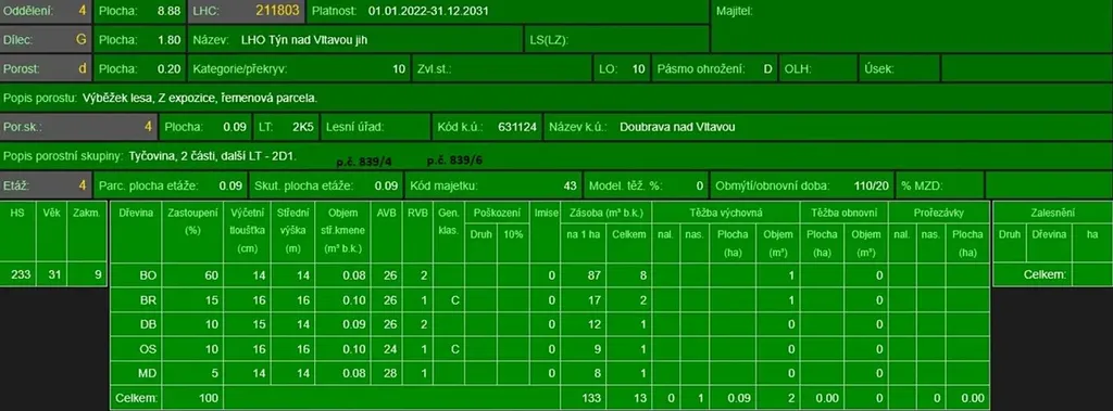 - p.č. 839/4 vedená jako lesní pozemek o celkové výměře 2 040 m2 (stáří lesa 91 let - zastoupení dřevin borovice, dub, stáří lesa 71 let - zastoupení dřevin borovice, smrk, stáří lesa 34 let - zastoupení dřevin borovice, bříza, dub, topol, modřín)