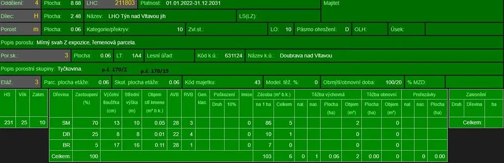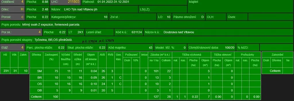 - p.č. 170/5 vedená jako lesní pozemek o celkové výměře 1 098 m2 (stáří lesa 34 let - zastoupení dřevin smrk, bříza, topol, dub)