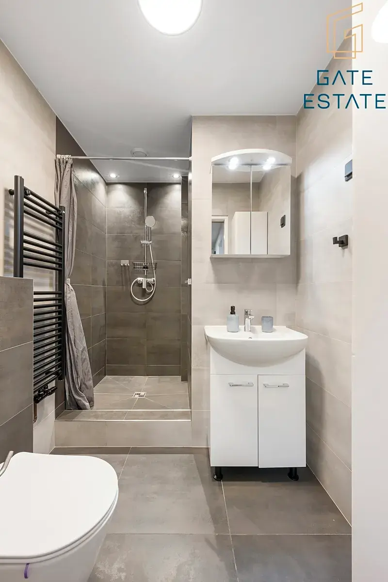 - Designová koupelna s kvalitními obklady, sprchovým koutem a WC.