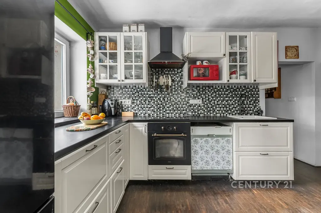 Kuchyně a úložné prostory: Moderní kuchyňská linka včetně vestavných spotřebičů (sklokeramická deska, trouba, myčka, digestoř).