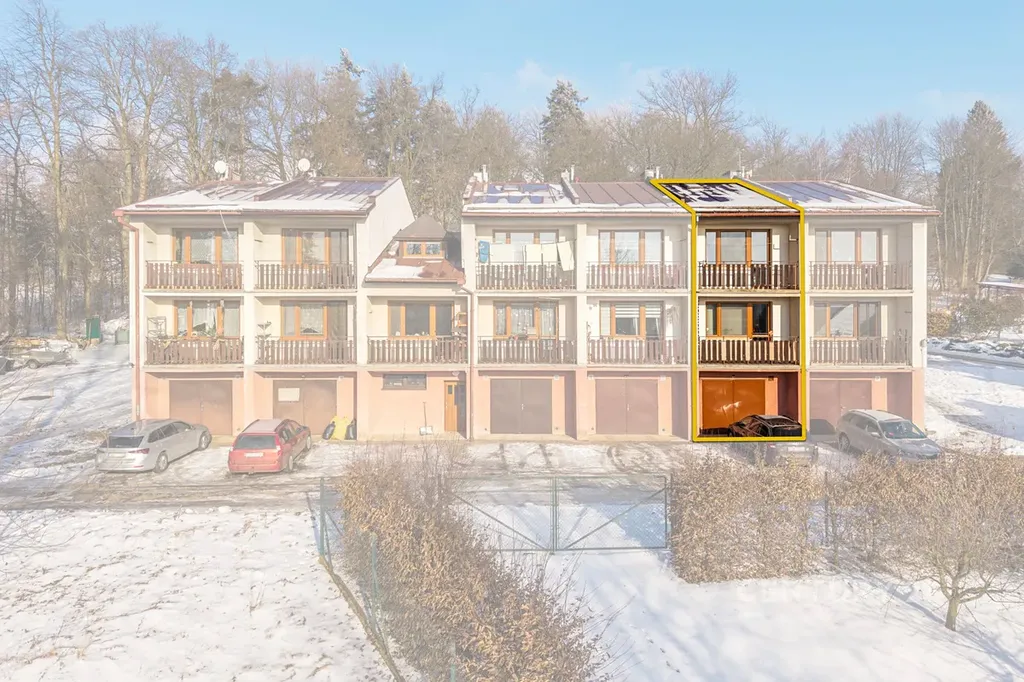 Součástí bytu jsou dva balkony, velká garáž 21 m², dva sklepy a podkrovní prostor připravený k dokončení na další obytný pokoj.