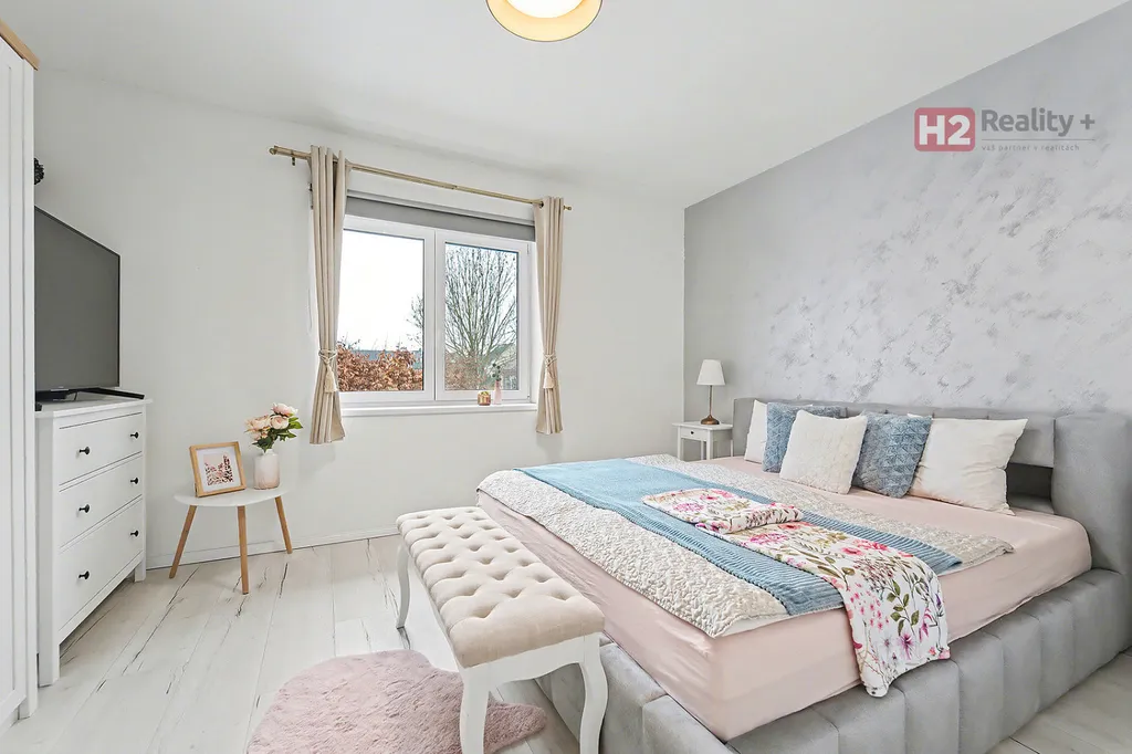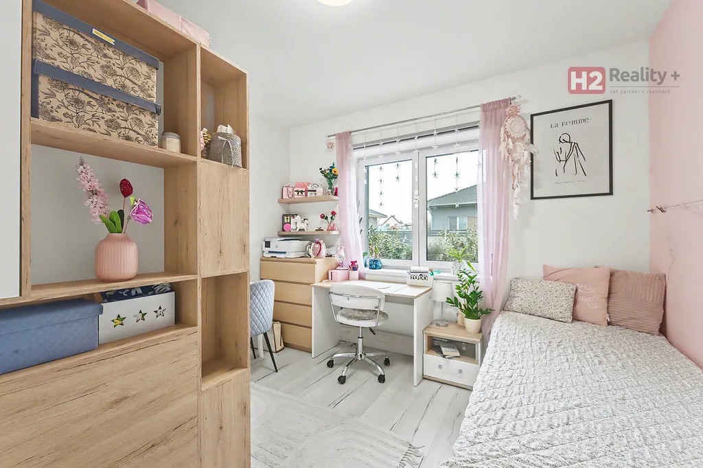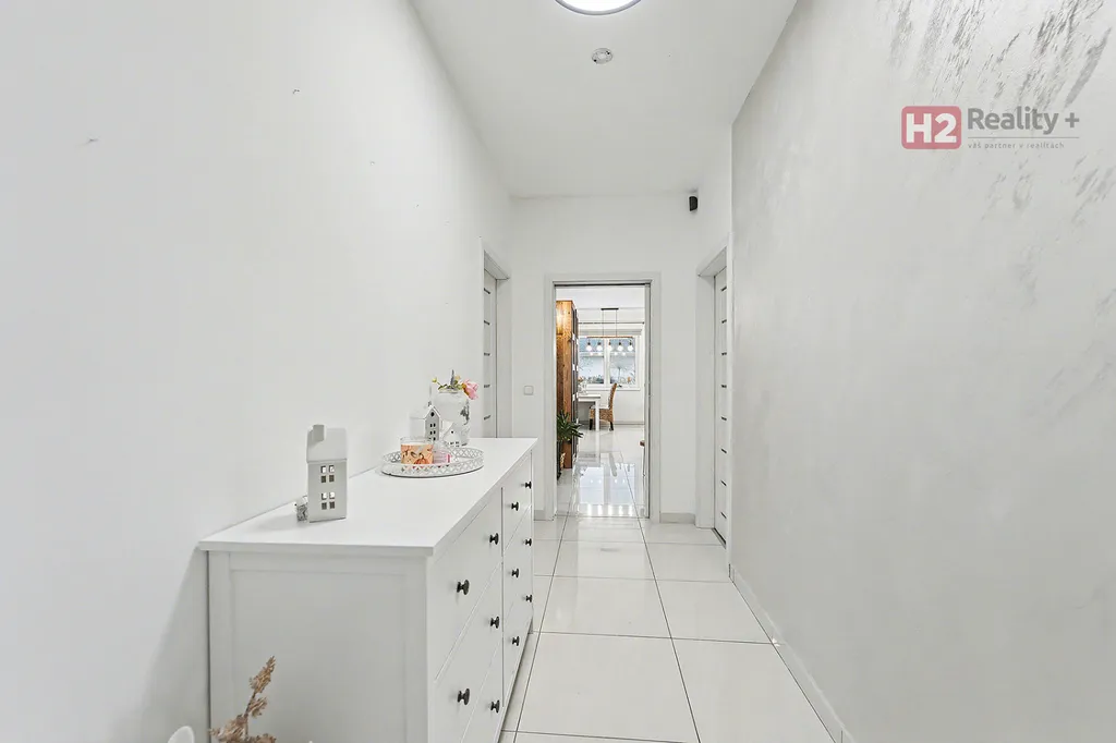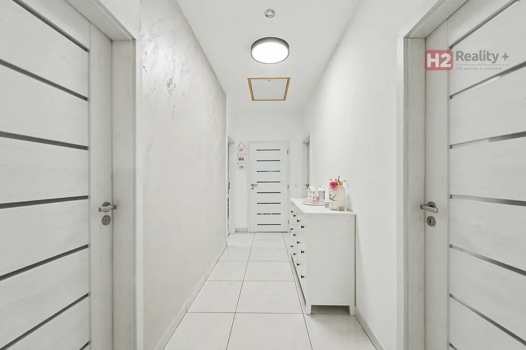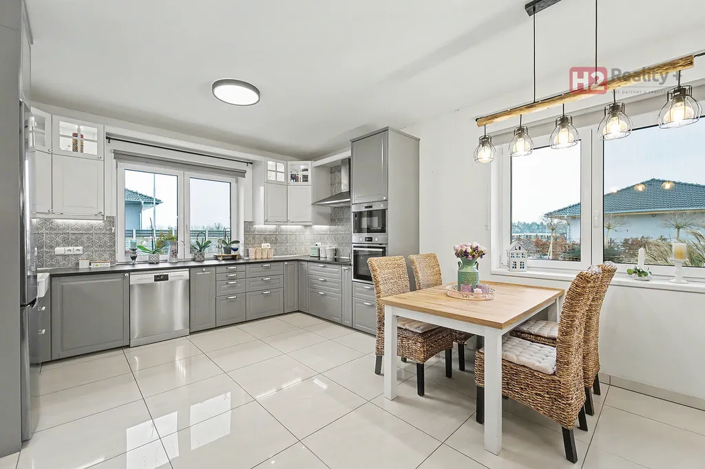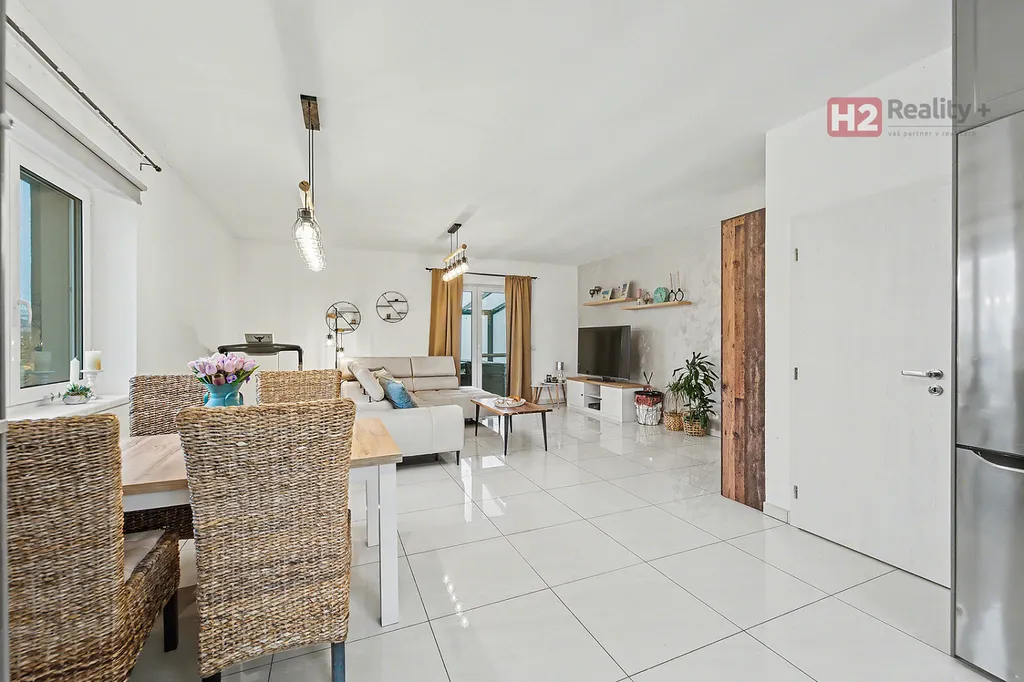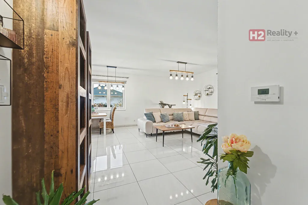 Centrem celého domu je velký a prosvětlený obývací pokoj (31 m²) spolu s prostorem pro kuchyň (12 m²) , z ob. pokoje snadný vstup na zahradu francouzským oknem, velkorysé řešení dispozice této části domu - umožňuje umístit sedací soupravu i jídelní část, kuchyň kompletně IKEA, navržena a vyrobena dle náročných požadavků klienta, velké množství odkládacích ploch, včetně spíže, veškeré spotřebiče ve vysoké kvalitě, díky oknu i skvělá světlost kuchyně, obývací pokoj a kuchyň osazeny dlažbou (velkoformátová SIKO), zbytek místností disponuje kvalitní plovoucí podlahou, Další tři místnosti mají samostatné vstupy, využívány jako ložnice a dětský pokoj (rozmístění již bude na nových uživatelích), možnost využívat plnohodnotnou koupelnu s toaletou, u vchodu ještě menší toaleta s umyvadlem, velkým benefitem je praktická šatna (4 m²). V celém domě podlahové topení, bezpečnostní systém AJAX, možnost napojit na bezpečnostní službu, vytápění a ohřev vody přes tepelné čerpadlo,