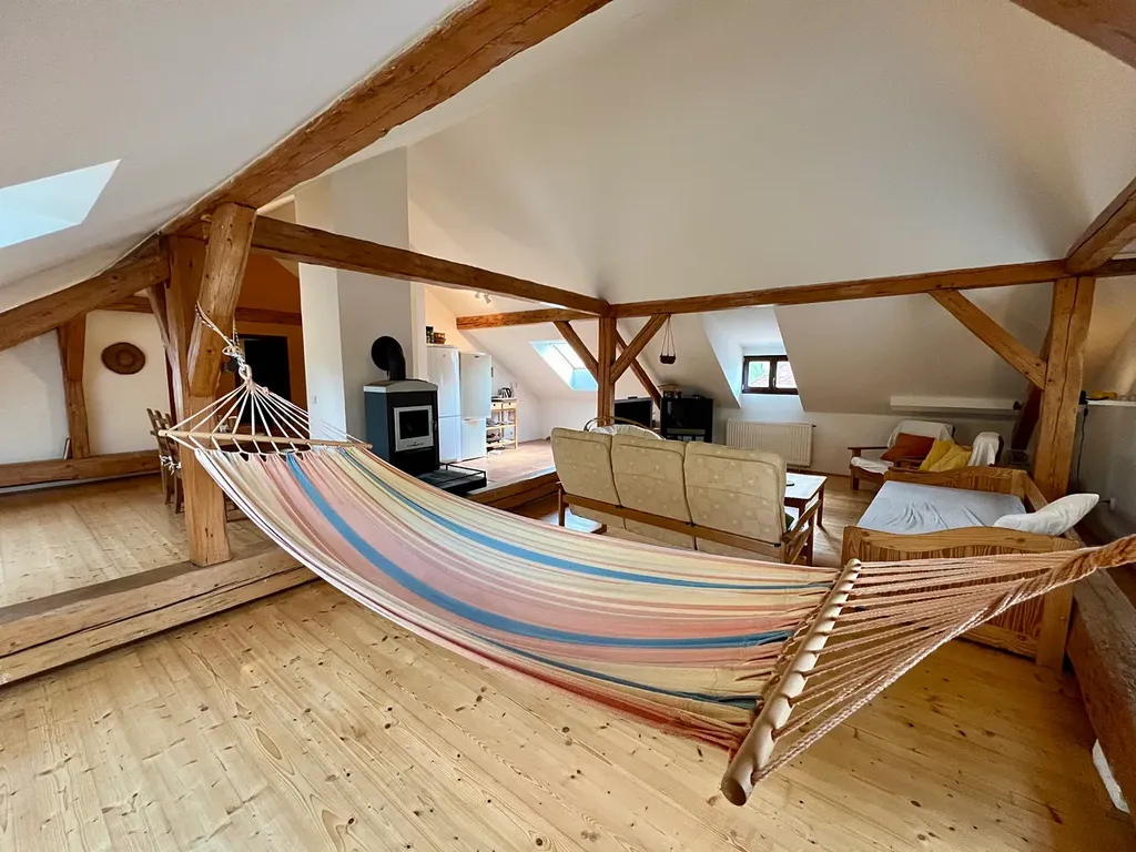 Druhé patro tvoří velký podkrovní apartmán s dominantním obývacím pokojem a přípravou na kuchyňský kout, 2 dvoulůžkové ložnice a koupelna.