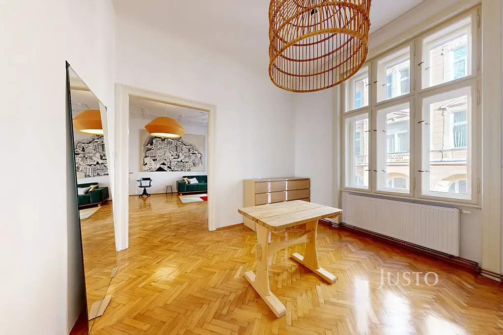 Prostorný a světlý obývací pokoj s krbem má nádherné vysoké stropy s ornamenty, které Vás zaujmou. Výhled budete mít přímo do ulice a na také na náměstí.