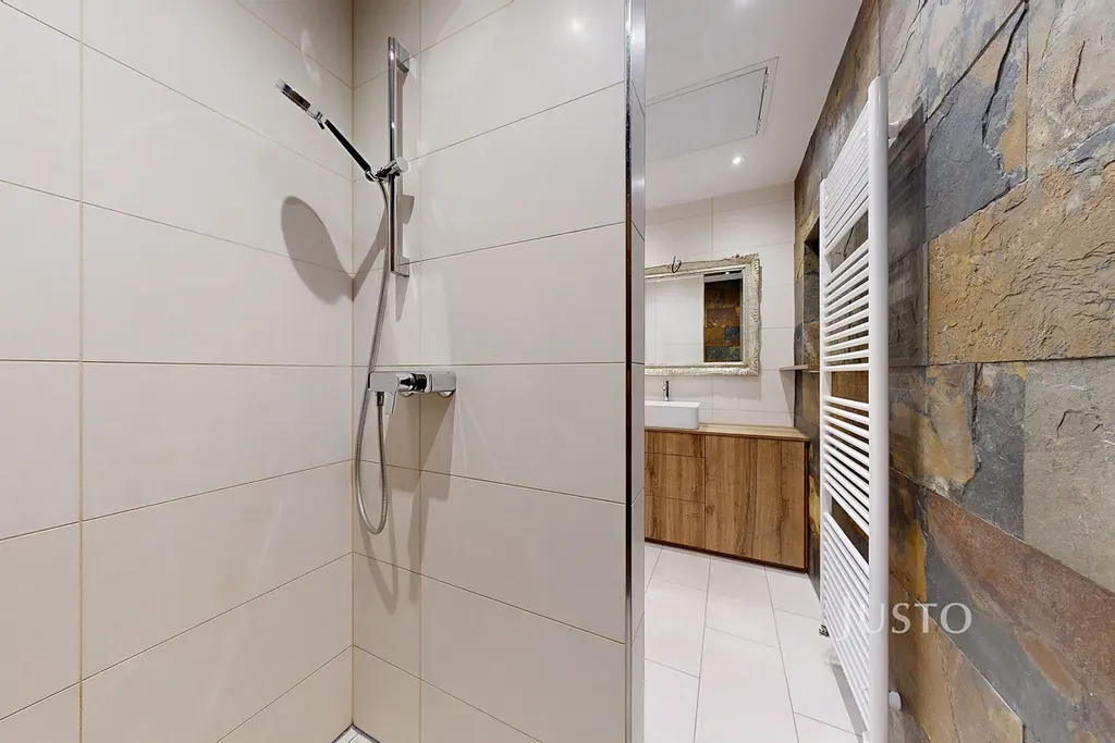 Přestože můžete na fotografiích vidět moderní, plně vybavenou kuchyň (plynový sporák, digestoř, lednice, myčka, trouba) majitel při rekonstrukci ctil atmosféru celého bytu. Samozřejmě nechybí vkusná koupelna se sprchovým koutem, umyvadlem a toaletou. V zimě Vás určitě potěší podlahové vytápění (koupelna, chodba, kuchyň). O ohřev vody a vytápění se v bytě stará plynový kotel. Neprůchozí ložnice přímo vybízí k odpočinku a její okna jsou orientována do vnitrobloku.