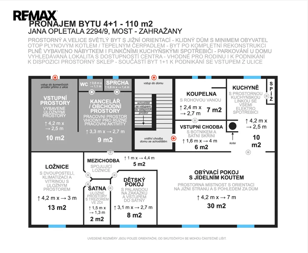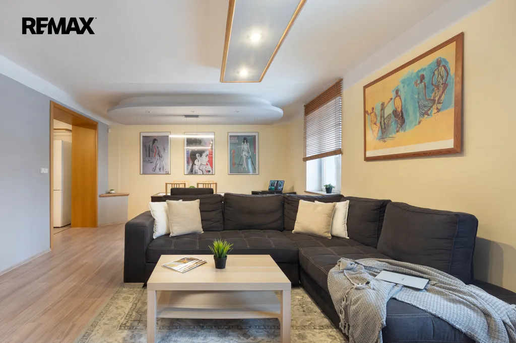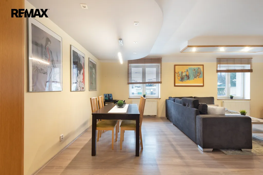 Byt o celkové ploše 110 m² vznikl propojením dispozic 3+1 a 1+1. Díky tomu přirozeně kombinuje soukromou rodinnou část s odděleným prostorem, který má také vlastní vstup přímo z ulice s možností různorodého využití (pro podnikání nebo jako dvougenerační bydlení pro rodiče či potomka). Detailní nákres prostoru bytu spolu s rozměry naleznete v přiloženém půdorysu.