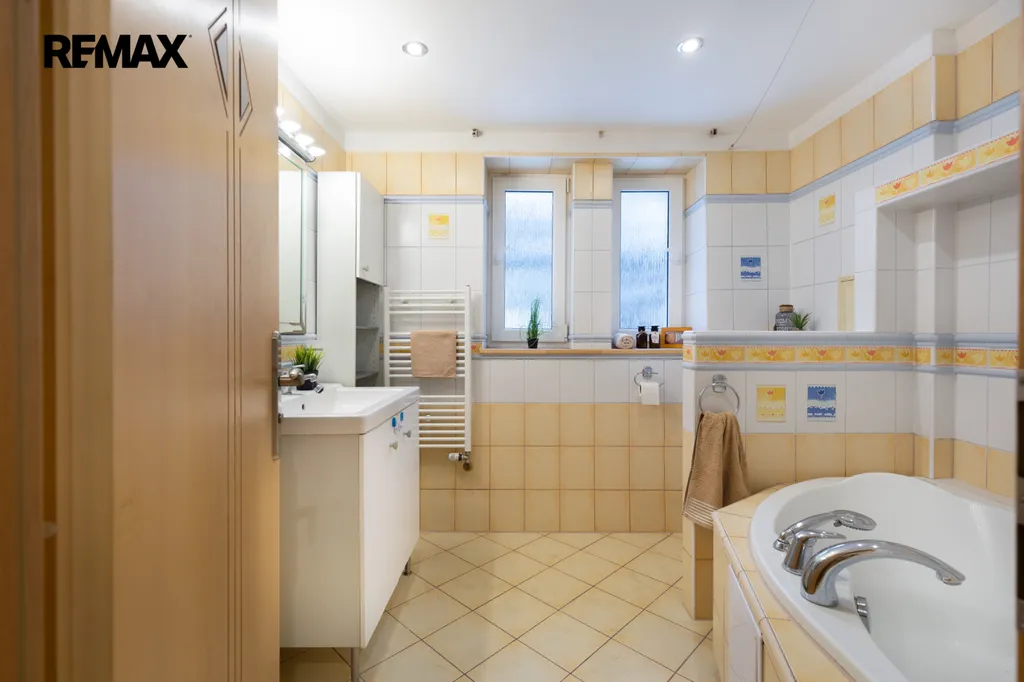 Koupelna je vybavena rohovou vanu pro pohodlnou relaxaci. Samozřejmostí je vstupní chodba s úložnými prostory.