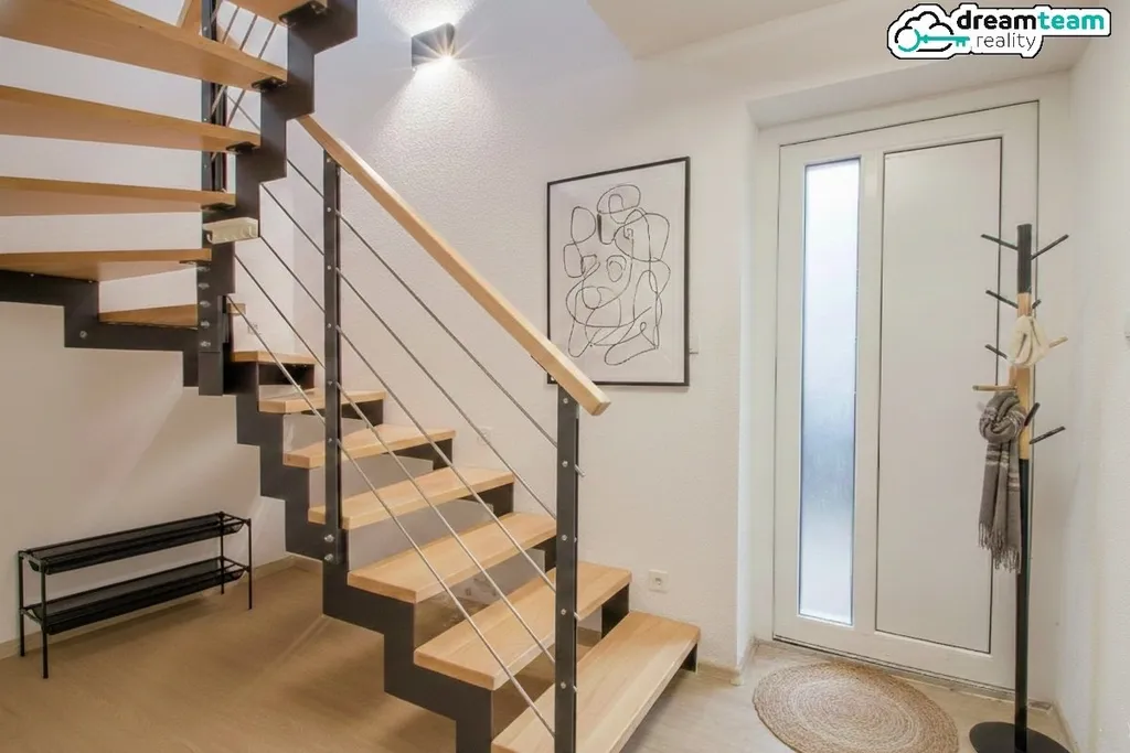 Moderní prostor s klimatizací. Byt má osmdesát jeden metrů čtverečních a je navržený prakticky – dvě neprůchozí ložnice v přízemí, o patro výš prostorná koupelna a otevřený prostor kuchyně s obývacím pokojem. Obývák má okna na východ, kuchyně na západ – takže ráno vás budí sluníčko v obýváku a večer si užíváte západ slunce při vaření. A když vám v létě bude horko, máte klimatizaci – podrobnosti ohledně nákladů probereme na prohlídce. Kuchyně je vybavená troubou a varnou deskou, případně lze dodat i lednici nebo myčku – všechno je na dohodě.