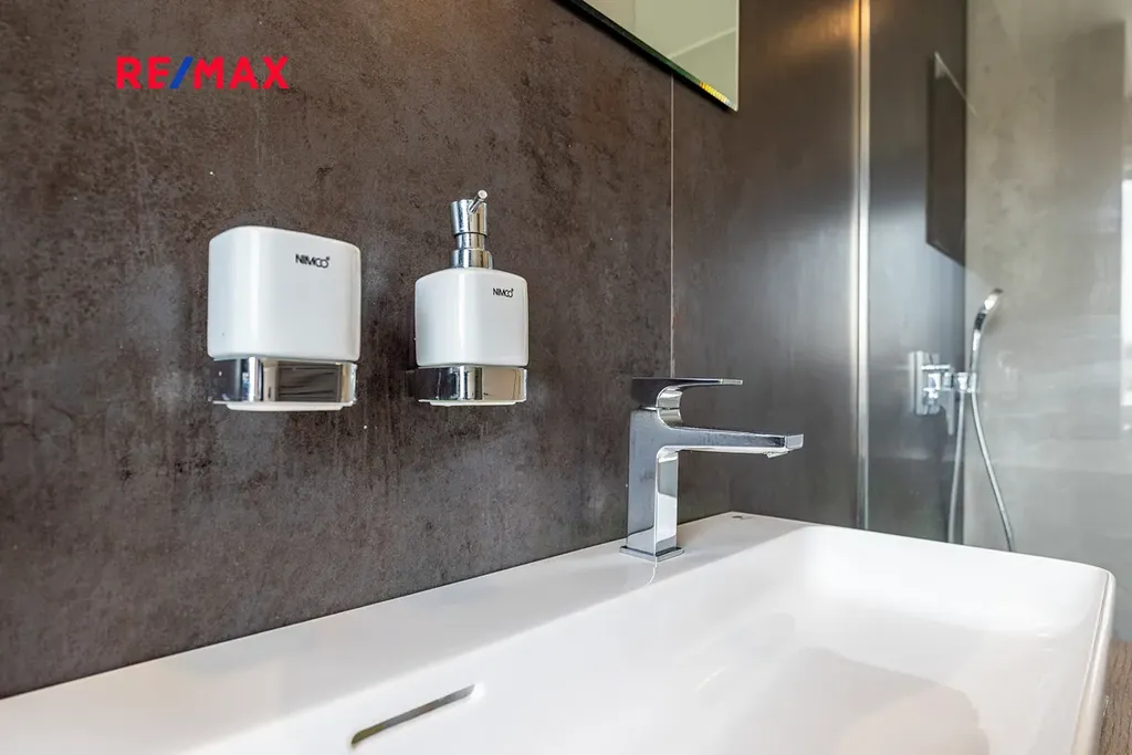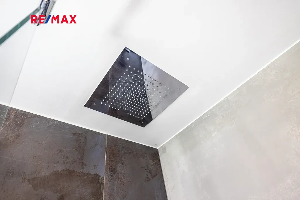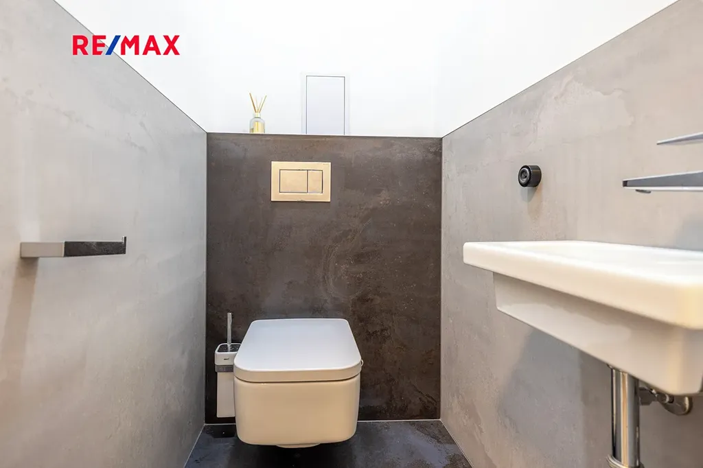 Koupelna kombinuje vanu, sprchový kout a WC a byla vybavena velkoformátovými obklady a dlažbou značky Villeroy & Boch. K dispozici je také samostatné WC a praktická technická místnost.