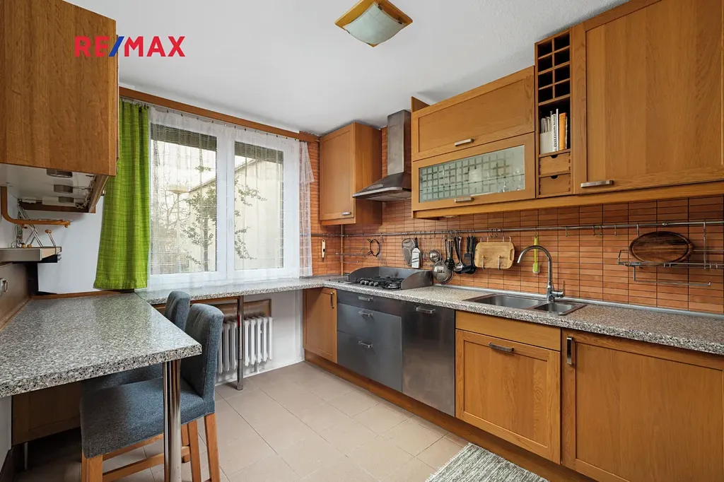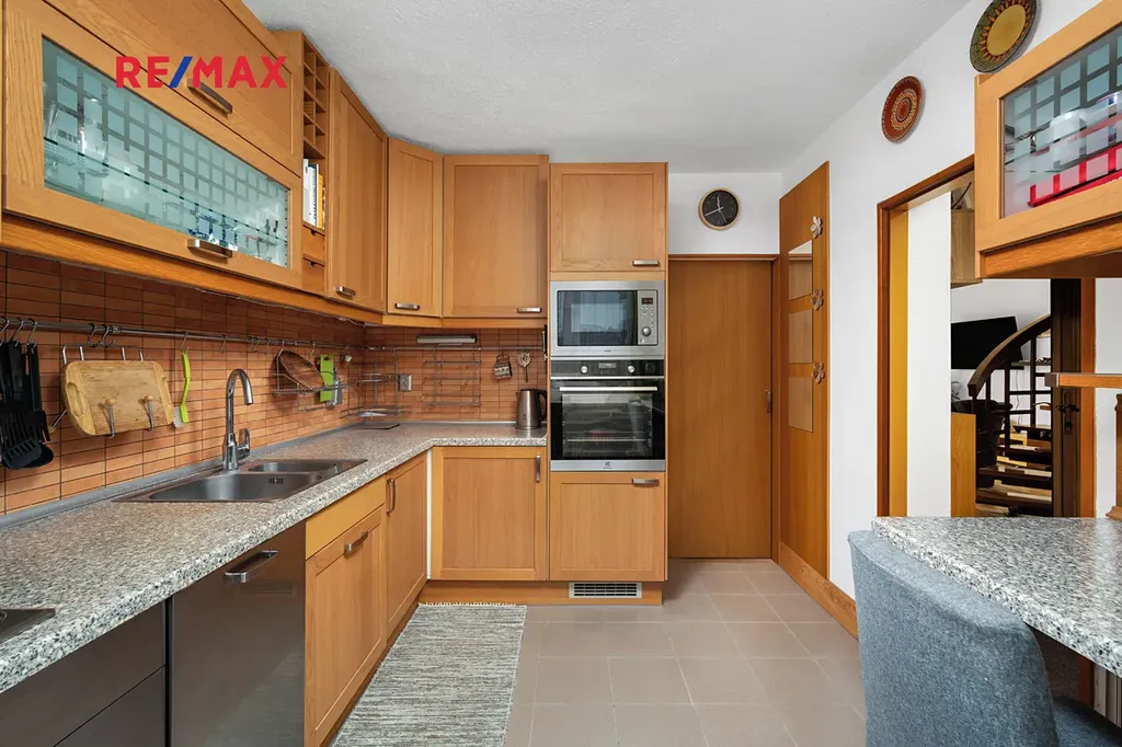 Kuchyň je vybavena vestavěnými spotřebiči – lednicí, troubou, myčkou, mikrovlnnou troubou a plynovým sporákem.