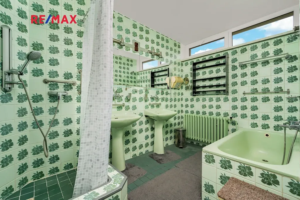 V patře najdete pracovnu (12,5 m²), ložnici (13,5 m²), dětský pokoj (13,1 m²) a prostornou koupelnu (9 m²) se dvěma umyvadly, vanou i sprchovým koutem. Samostatné WC je v přízemí i v patře.