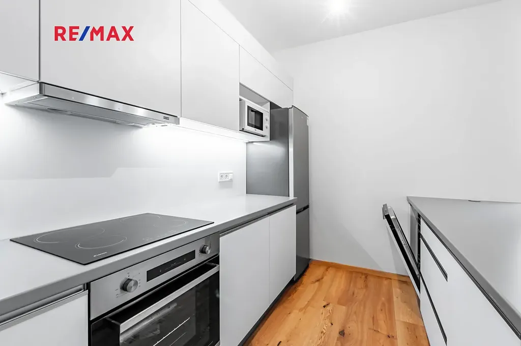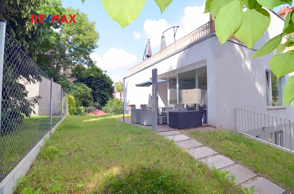 a samozřejmostí je i klimatizace. Byt se nachází v prvním a druhém nadzemním podlaží. Z prostorné vstupní haly (7 m2) doplněné menší komorou a vestavnou skříní se vchází do chodby odkud jsou přístupné tři místnosti, dvě ložnice (každá 10 m2) a pracovna či další ložnice pro hosty (7 m2). Z jedné z těchto ložnic je i přímý výstup na spodní část pozemku, která se užívá pouze s tímto bytem. V tomto podlaží je k dispozici ještě koupelna s vanou a WC a také samostatné WC s umyvadlem. Z chodby vystoupáte po dřevěném schodišti do velkorysého obývacího pokoje o velikosti 42 m2 s kuchyňskou linkou. Ta je vybavena lednicí s mrazákem, myčkou, dřezem, varnou deskou a elektrickou troubou. Odvětrání je zajištěno pomocí digestoře. Z obývacího pokoje za kuchyní pak vejdete do ložnice rodičů (13,6 m2), která je doplněna vlastní koupelnou se sprchovým koutem a WC. Více v přiložených půdorysech. Dominantou obývacího pokoje je velká prosklená stěna, na kterou navazuje zpevněná dřevěná terasa (15 m2) s jižní orientací. Okolo východní a jižní strany bytu se nachází dvouúrovňová předzahrádka spojená schodištěm. U vstupu do bytu pak jsou k dispozici 2 parkovací stání, která je možno si pronajmout spolu s bytem - obě za 3.000,- Kč měsíčně.