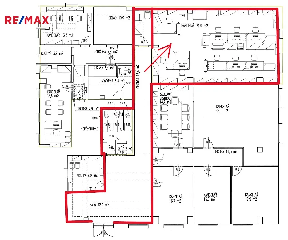 Kancelář není vybavena nábytkem. Společná kuchyňka s WC. K dispozici je možnost pronajmout si více kanceláří najednou, které se nacházejí na stejném patře.