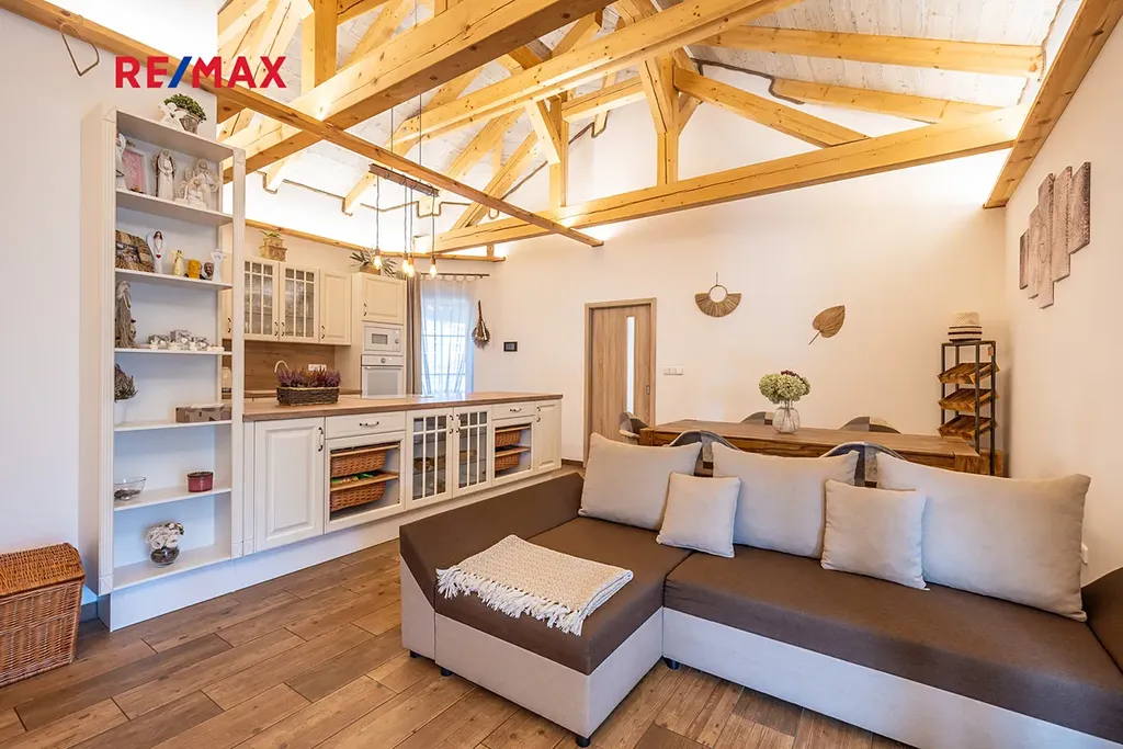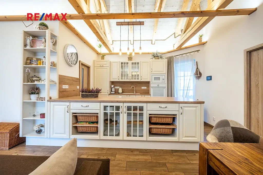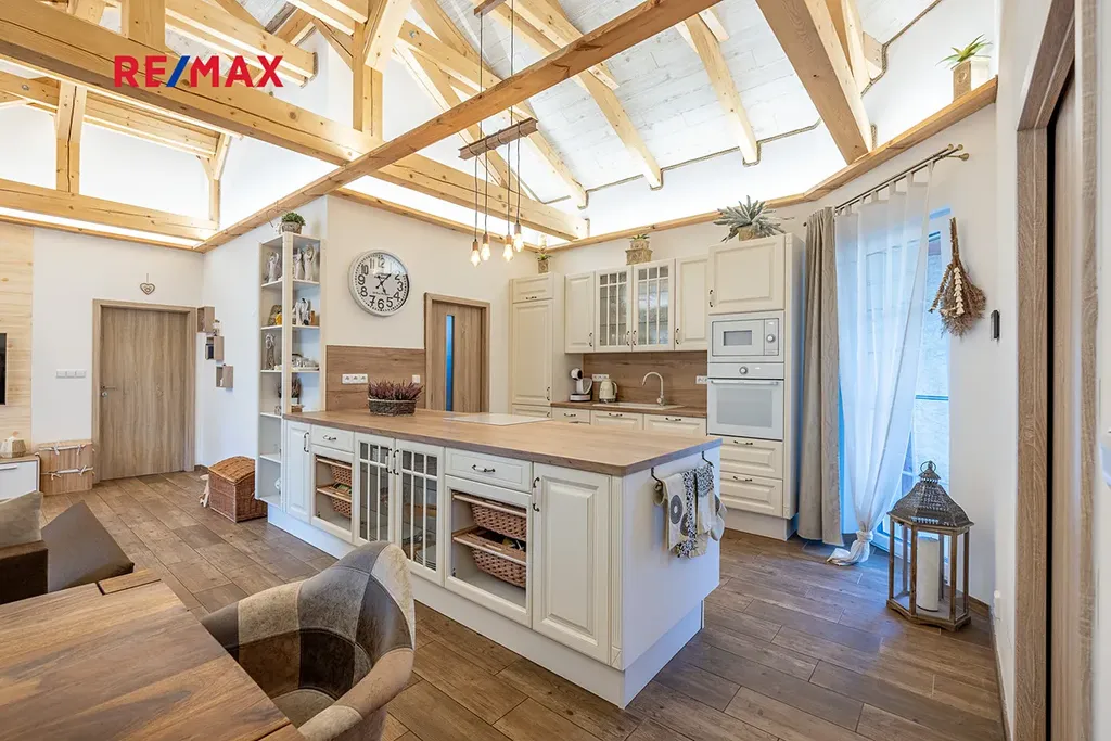 Dominantou domu je prostorná kuchyně propojená s obývacím pokojem, kde vás na první pohled zaujme otevřený strop s přiznanými krovy a decentním podsvícením, které vytváří útulnou atmosféru. V kuchyni byl použit masiv, což zajišťuje nejen vysokou kvalitu, ale i nadčasový vzhled. Celý dům je orientován na jih, což zaručuje dostatek přirozeného světla po celý den. V každém pokoji jsou francouzské dveře a je tak možné projít na zahradu přímo z pokoje, či ložnice.