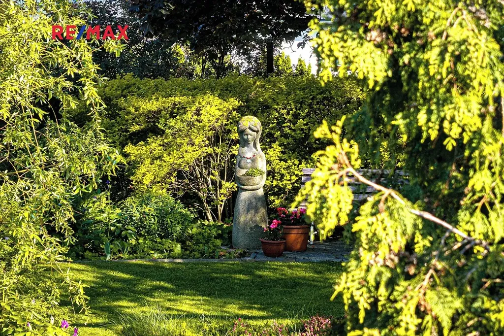 Samotná dechberoucí okrasná zahrada se vzrostlými stromy a dvěma jezírky, poskytuje maximální soukromí a vybízí k odpočinku či k setkávání s rodinou a přáteli. Najdete zde i užitnou část pro pěstování vlastní zeleniny. A jste-li milovníky přírody, jistě vás potěší množství živočichů, kteří zde našli své útočiště. V jarních a letních měsících se můžete zaposlouchat do ptačího zpěvu či milostného kuňkání žab. Pro údržbu zahrady vám ráda doporučím zahradníka.