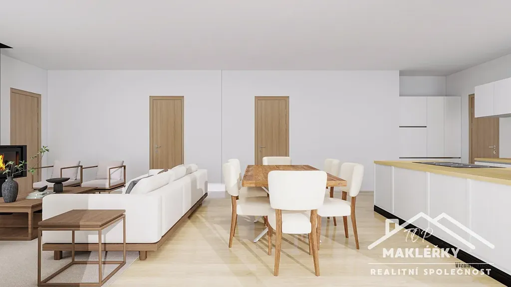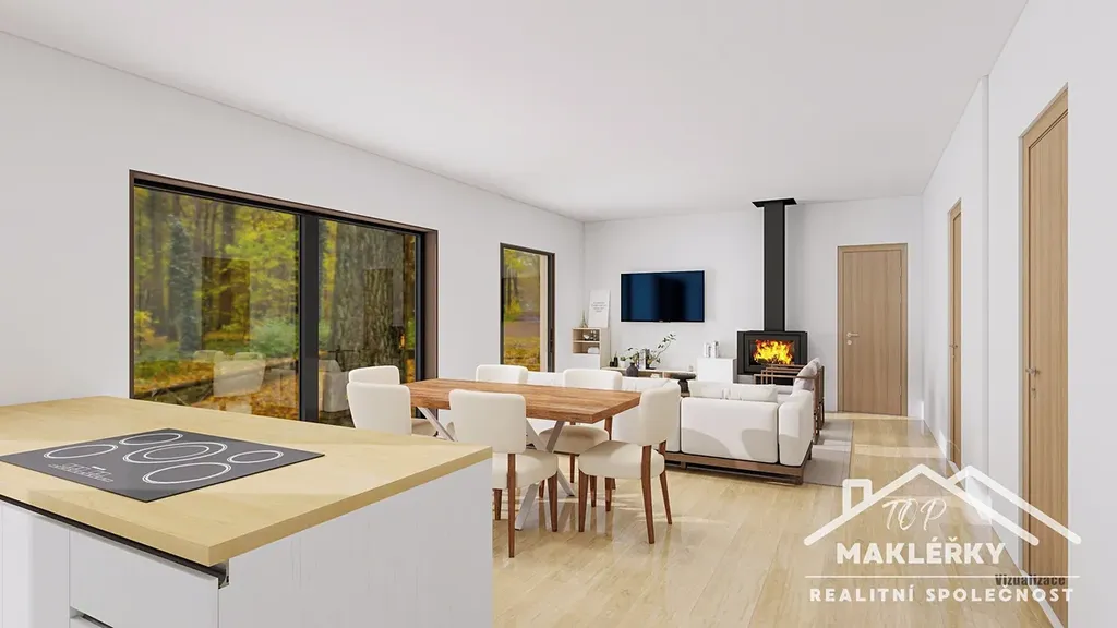 Dominantou domu je pak velkorysý obývací prostor s kuchyní a jídelnou se vzdušným otevřeným stropem do krovu. Součástí tohoto prostoru je stylový komín s přípravou pro instalaci krbových kamen, která budou sloužit jako designový prvek, k navození romantické atmosféry a zároveň funkční, bivalentní zdroj, který je schopen pokrýt primární potřebu tepla domu.