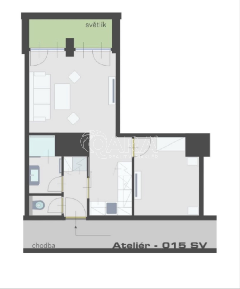 Dispozice bytu: obývací pokoj a kuchyň, samostatná ložnice, předsíň, samostatné WC a koupelna, příprava pro pračku. Nové spol. prostory v domě. Společná pračka se sušičkou.