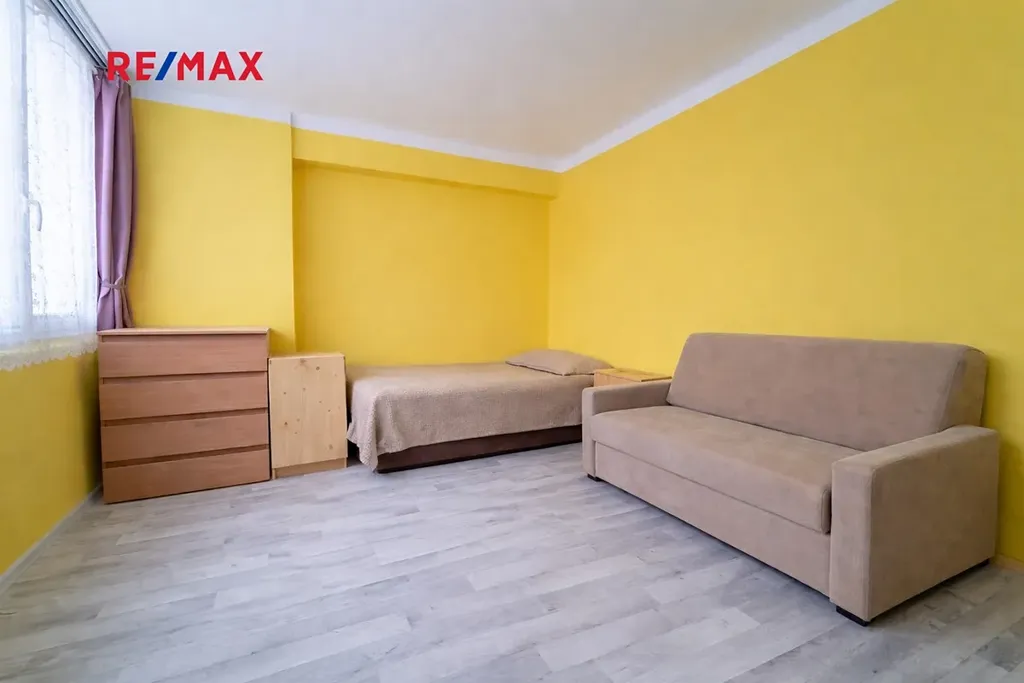 Bytová jednotka 1+1, po rekonstrukci (elektřina, odpady, sociální zařízení), se nachází ve zvýšeném přízemí z 12 pater. Dispoziční řešení: kuchyň, místnost, chodbička s úložným prostorem a koupelna s toaletou. Součástí tržní ceny je kuchyňská linka mimo spotřebičů a vybavení v koupelně s toaletou. Po ploše bytu bylo položeno PVC a dlažba.