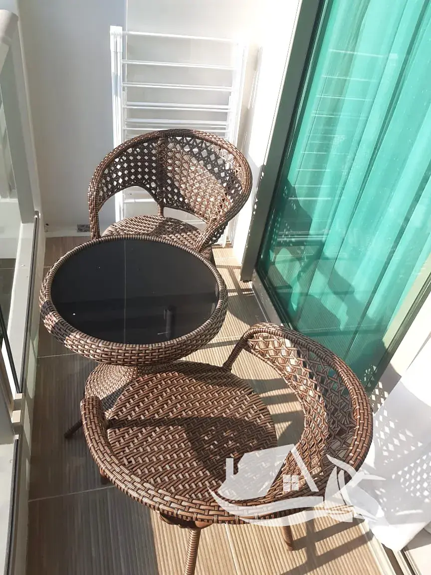 Dispozice apartmánu zahrnuje jednu prostornou ložnici, elegantní koupelnu a moderní obývací pokoj s kuchyňským koutem. Vše je navrženo s důrazem na maximální pohodlí a estetickou harmonii.
