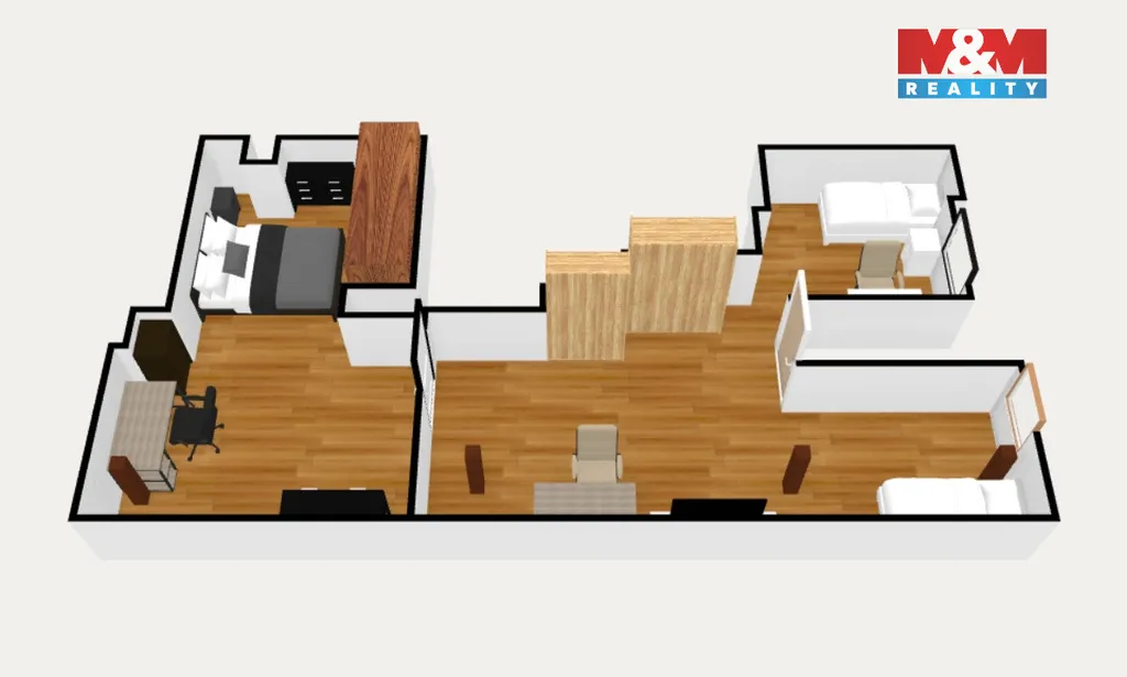 Byt je rozdělen do dvou podlaží. Ve spodní části je kuchyně, koupelna a velkorysý obývací pokoj se schodištěm do podkroví. Horní patro nabízí útulnou atmosféru se šikmými stropy, trámy a třemi pokoji – ideálními pro ložnici, děti či pracovnu.
