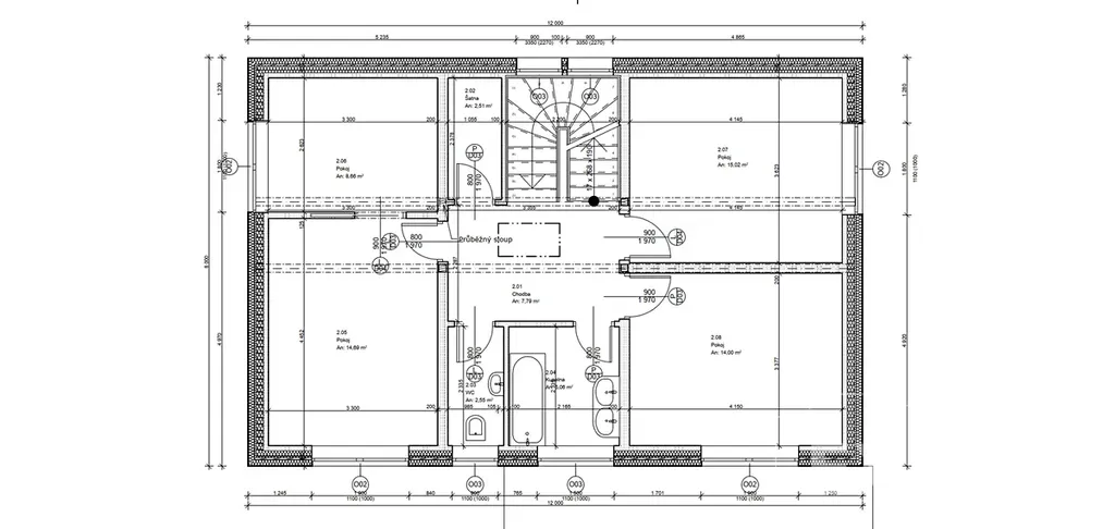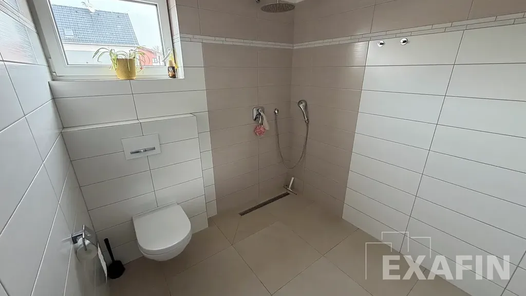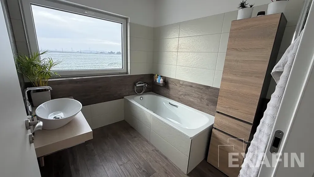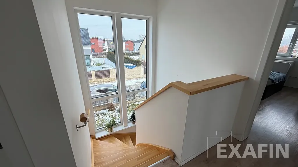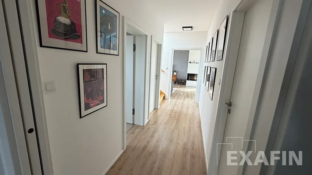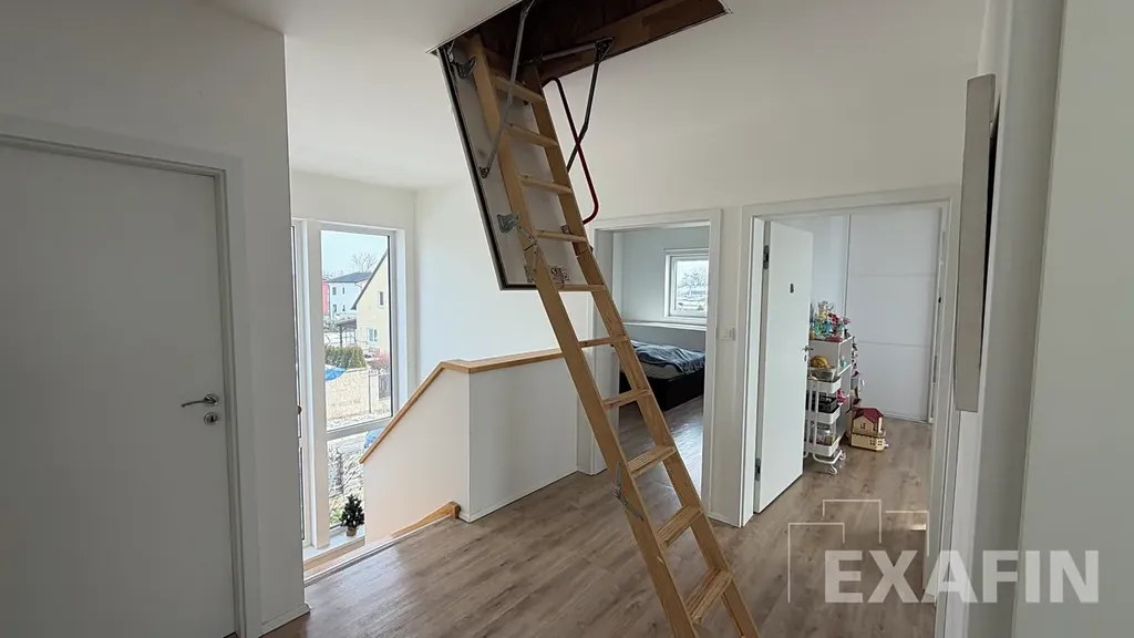 V horní části domu jsou tři samostatné pokoje, u ložnice je veliká šatna, kterou lze využívat i jako pracovnu, neboť má okno. Koupelna má vanu. Na chodbě je dále komora a vstup na půdu, která nabízí dostatek úložného prostoru pro věci, které zrovna nepotřebujete.