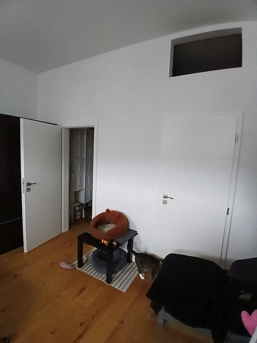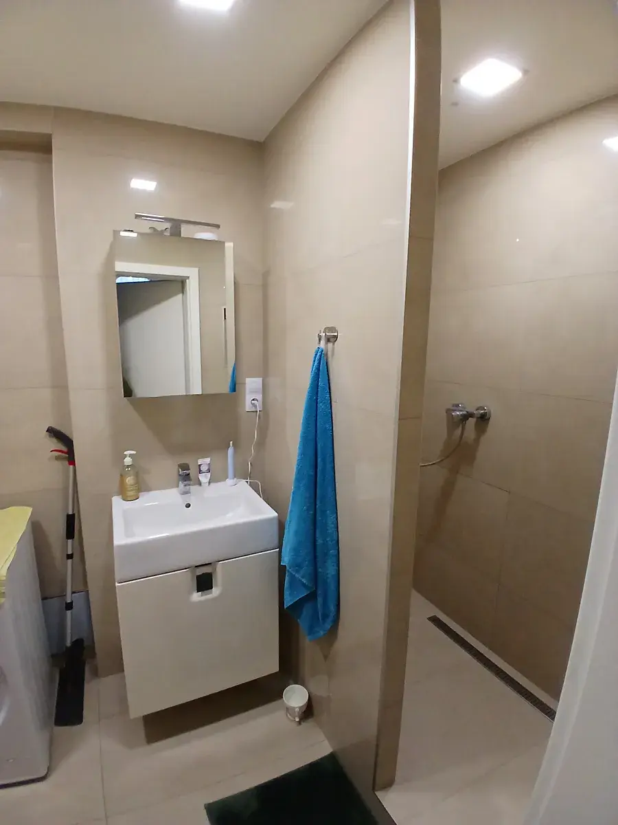 Dispozice bytu je řešena: vstupní předsíň s vestavěnou skříní a vstupem na toaletu, obývací pokoj se zařízeným kuchyňským koutem (lednice, myčka, elektrická trouba, varná deska, mikrovlnka). Z obývacího pokoje se vchází do prostorné ložnice u které je samostatná šatna a vstup do koupelny se sprchovým koutem. V rámci koupelny je plynový kotel na topení a ohřev vody a pračka. Nad koupelnou je další úložný prostor. Okna jsou dřevěná špaletová se žaluziemi. Orientace oken je na sever do ulice Pobřežní. Na podlahách je třívrstvá dřevěná podlaha a v předsíni dlažba.