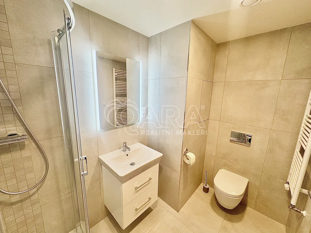 Dispozici bytu tvoří vstupní chodba s vestavěnou skříní, hlavní obytná místnost s kuchyňským koutem, dále koupelna se sprchovým koutem a toaletou. Kuchyňská linka je plně vybavena spotřebiči – k dispozici je myčka, mikrovlnná trouba, trouba, elektrická varná deska a digestoř. Velká lednice s mrazákem. V koupelně je pračka se sušičkou. Byt je vybaven rekuperační jednotkou, která pomaha šetřit na vytapení bytu.