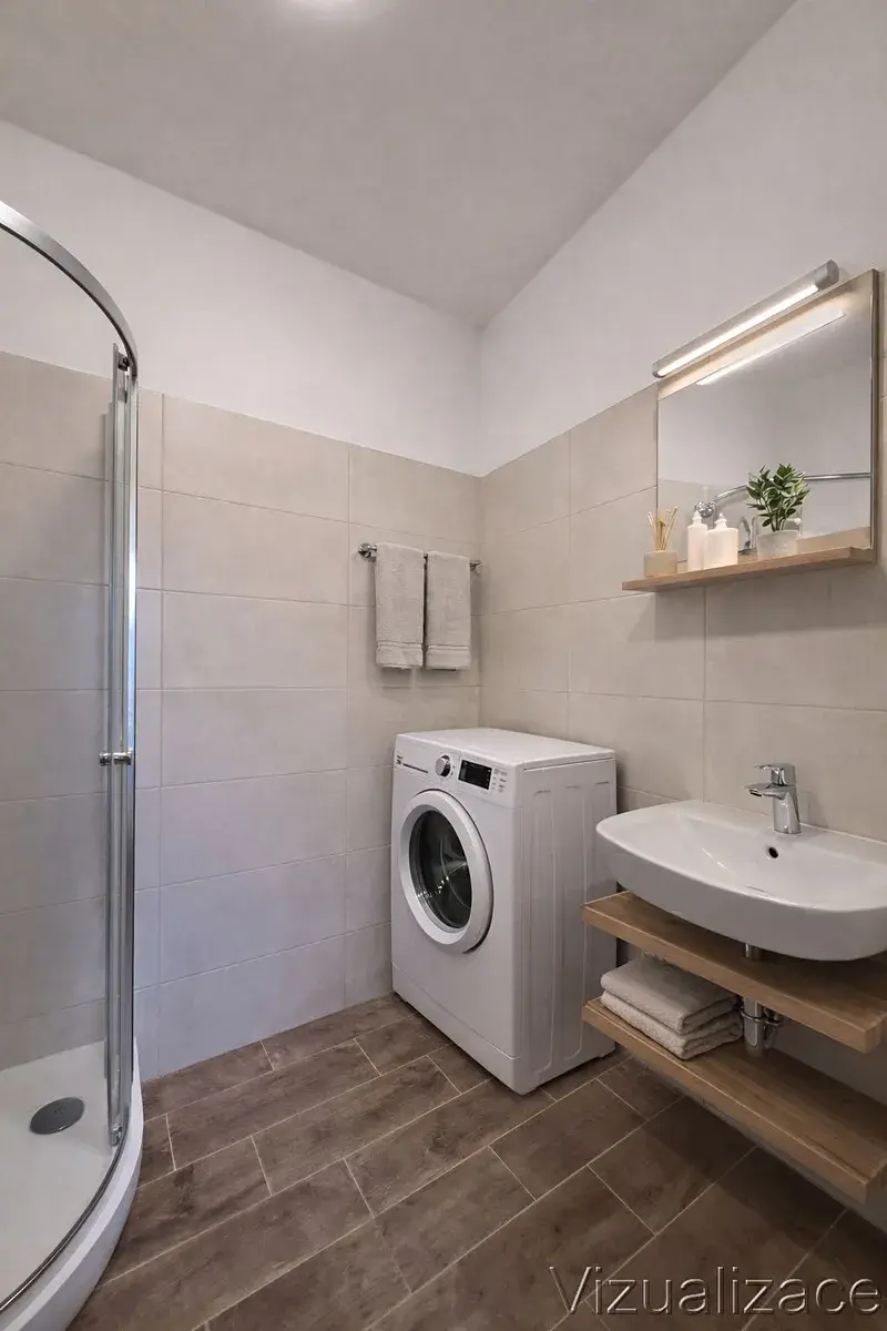 • moderní koupelna se sprchovým koutem, umyvadlem a WC