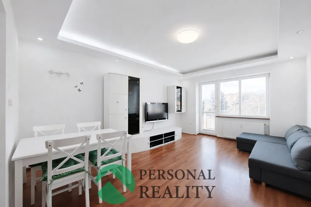 Dominantou bytu je obývací prostor se vstupem na balkon orientovaný na západ s příjemným výhledem.
