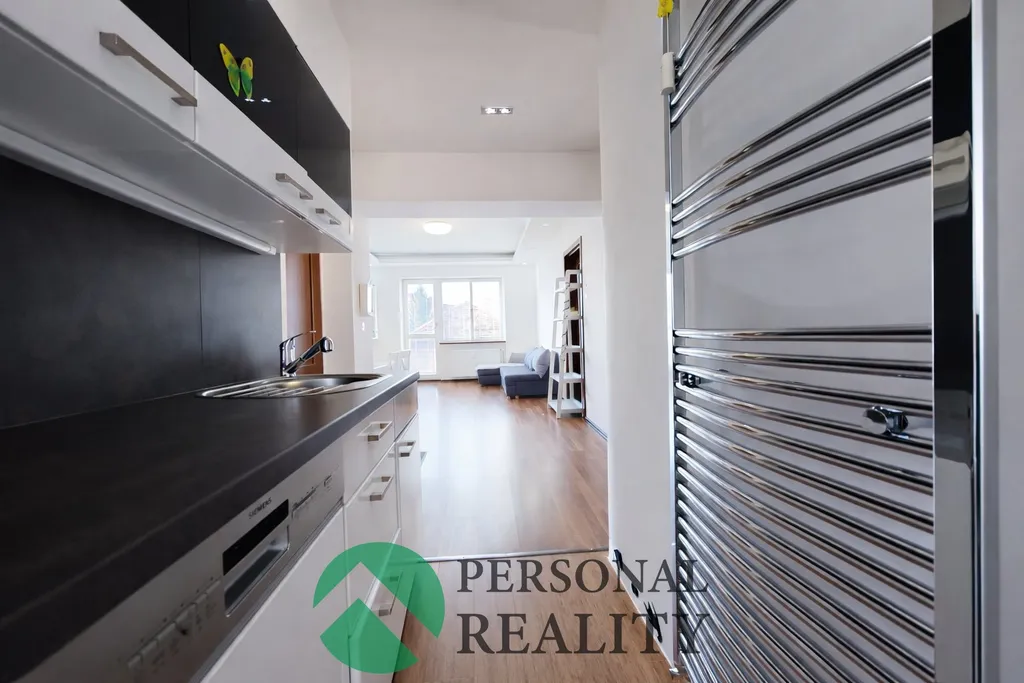 Kuchyňský kout je vybaven kvalitní kuchyňskou linkou a disponuje francouzským oknem orientovaným na východ, které zajišťuje dostatek přirozeného světla po celý den.