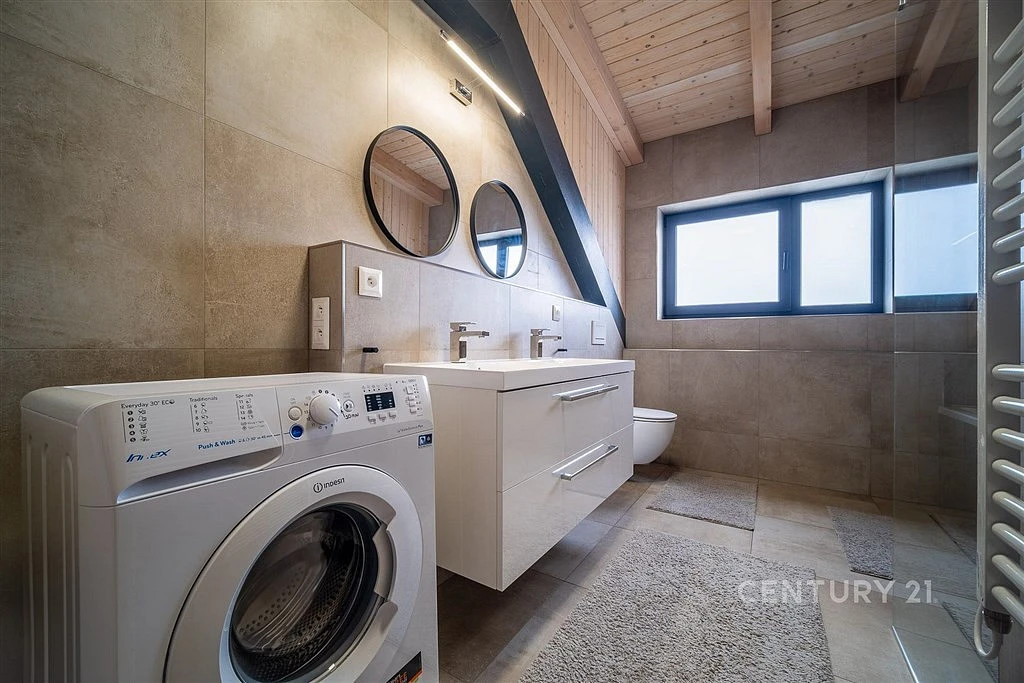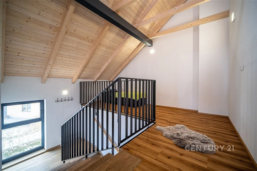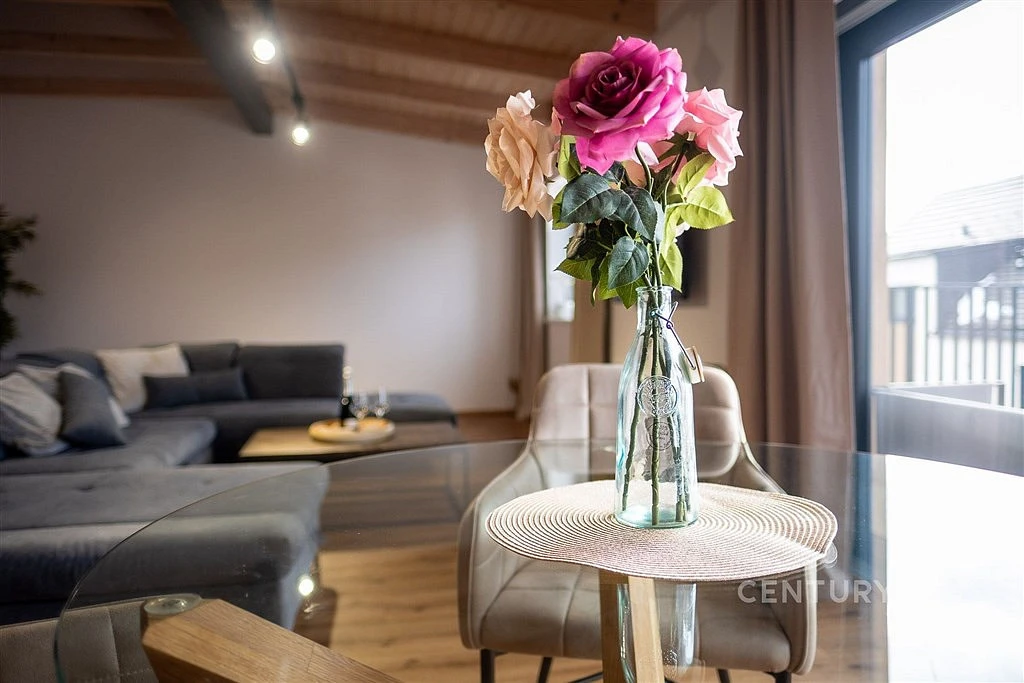 Přístup k hlavnímu vchodu bytového domu je řešen ze zadní zahrádky. Dále po krátkém vnitřním schodišti ke vstupním dveřím bytu. Vstupujeme do otevřené galerie s pracovnou (20,65 m²). Navazující chodba zajištuje vstup do již zmíněného obytného prostoru s kuchyňským koutem (47,55 m²) a přímým vstupem na terasu (13 m²). Kuchyně je vybavena moderní kuchyňskou linou, barovým pultem a v obytném prostoru se nachází sedací souprava a další vybavení. Z obytného prostoru je přístupný pokoj (15,75 m²). Z chodby je vstup do koupelny (8,30 m²), samostatné WC místnosti, šatny (6,57 m²) a ložnice (16,45 m²). Koupelna je vybavena vanou, sprchovým koutem s WalkIn zástěnou, umyvadlem, toaletou a pračkou. V ložnici i v pokoji se nachází dvoulůžkové postele a skříně.