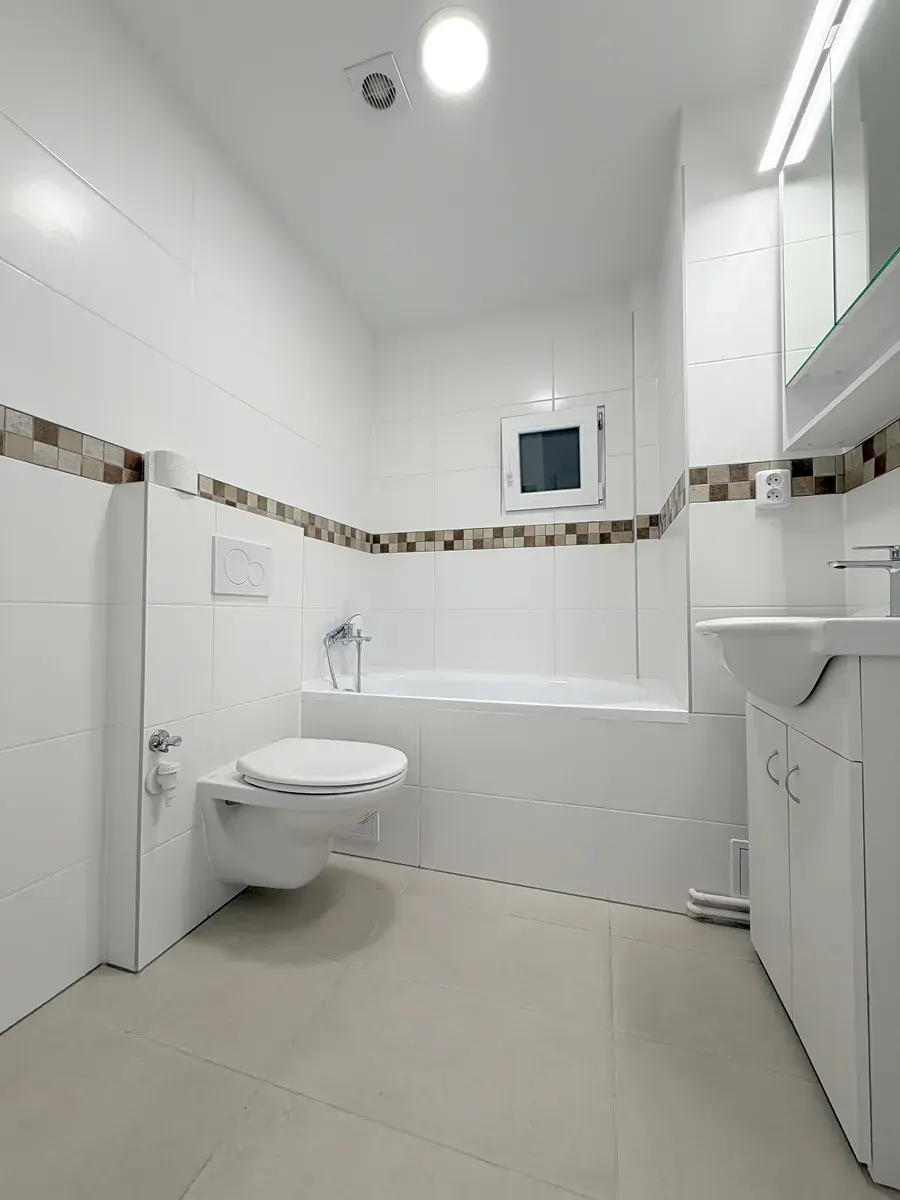 Obývací pokoj s kuchyňským koutem je orientován na jih s výhledem do tiché ulice. Koupelna s vanou je společně s WC. Součástí bytu je kuchyňská linka, kombinovaný sporák, digestoř, přípojka na myčku v kuchyni a na pračku v koupelně, možnost dodání lednice.