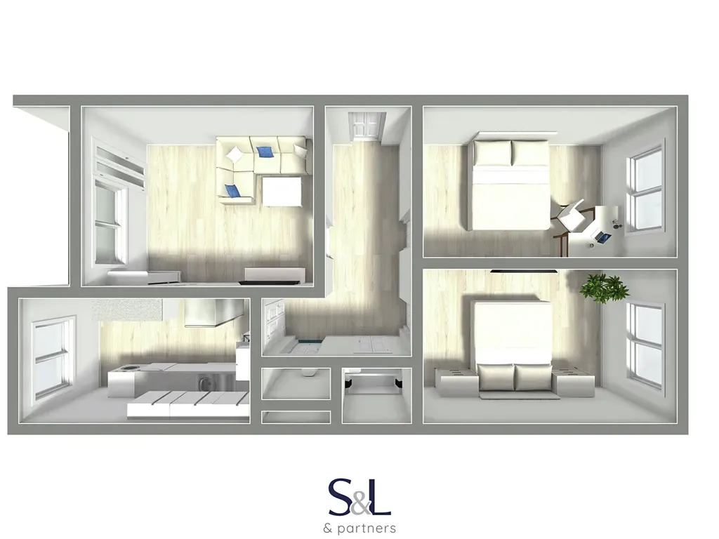 Dispozici tvoří předsíň, ze které vede vstup do dvou pokojů, průchozího obývacího pokoje a kuchyně. Dále je zde nová koupelna s vanou a samostatnou toaletou.