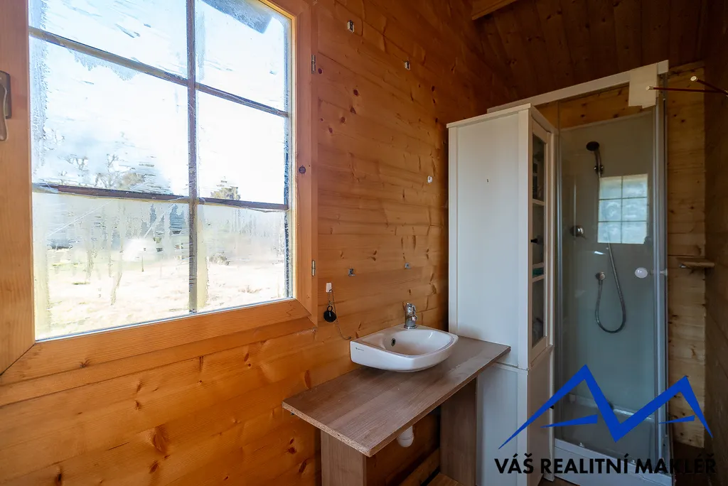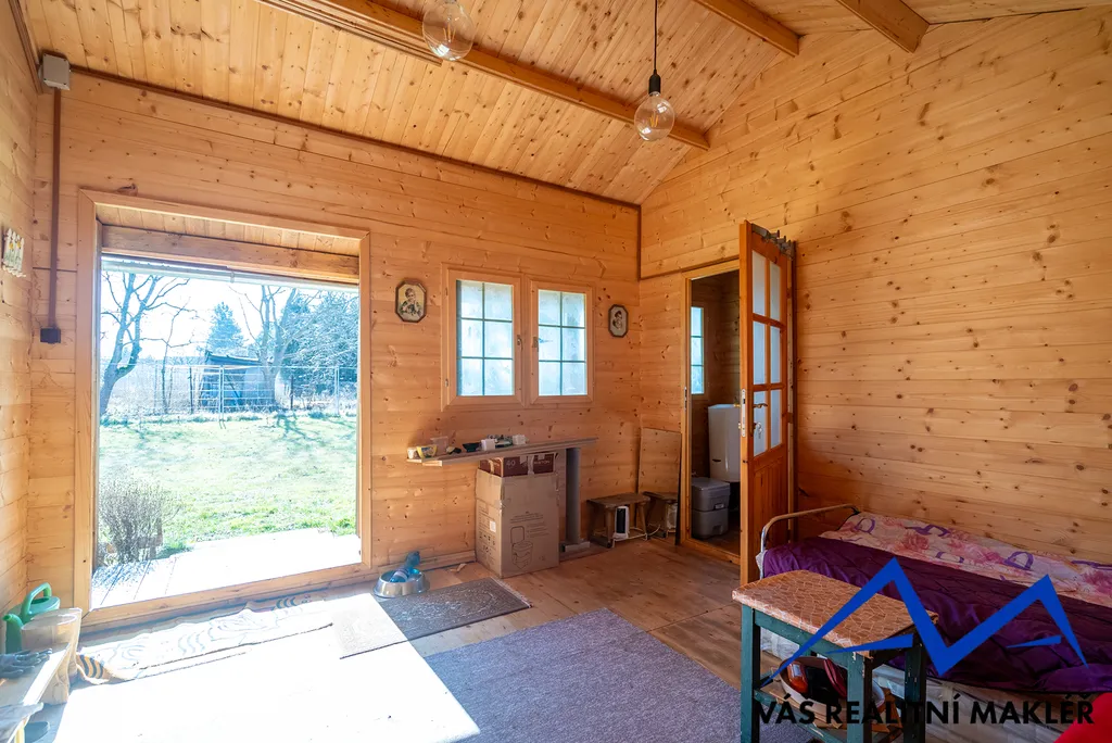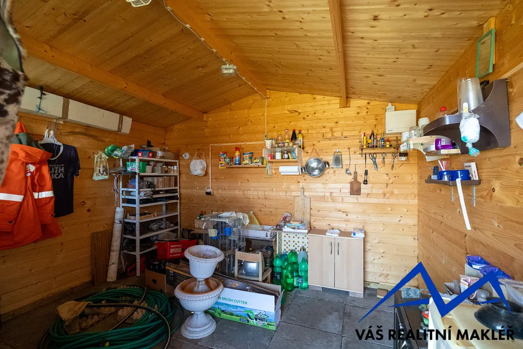 Druhá chata (12 m² ) je využívána jako sklad na nářadí. Je zde i lednice a elektrický ohřívač k přípravě jídel.