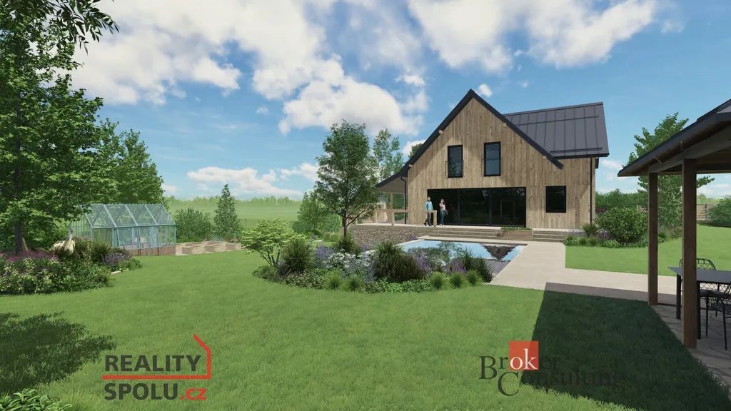 Na prezentaci je použita vizualizace rodinného domu, který není součástí prodeje, ale je na něj již vytvořena projektová dokumentace včetně architektonického zpracování vizualizace zahrady, což je velkou výhodou, čili je zde možno pokračovat v cestě ke stavebnímu povolení, což by Vám ušetřilo mnoho času.