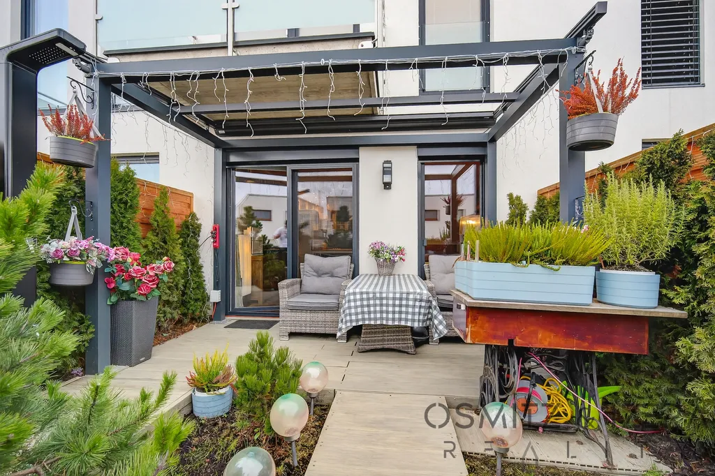 • Vybavení zahrady: Hliníková pergola s motorickou střechou TaHoma, ratanové sezení, solární sprcha, vzrostlé jehličnany, venkovní osvětlení a přívod vody.