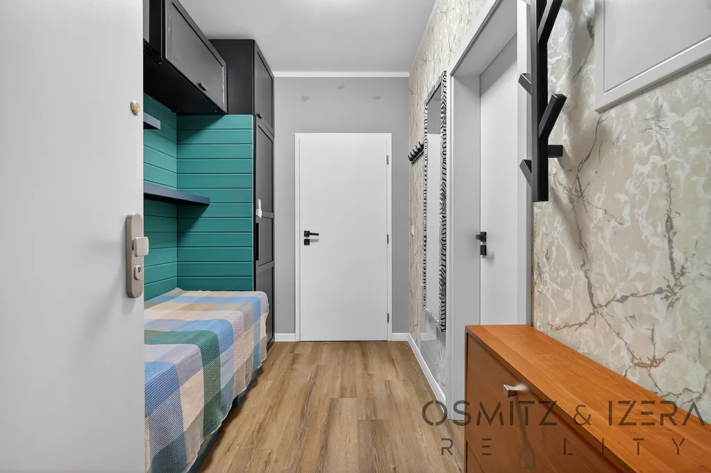 Byt v moderním designu lze snadno příčkou upravit na 2kk. Aktuálně jej tvoří prostorný obývací pokoj s kuchyní, ložnice oddělená japonskými stěnami a menší pracovna.