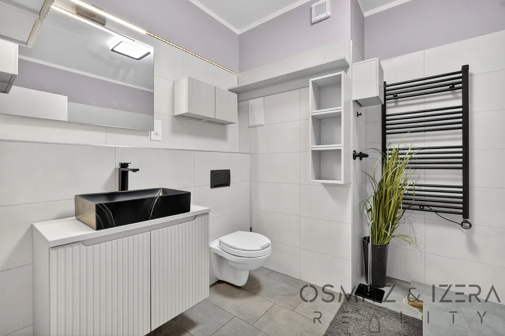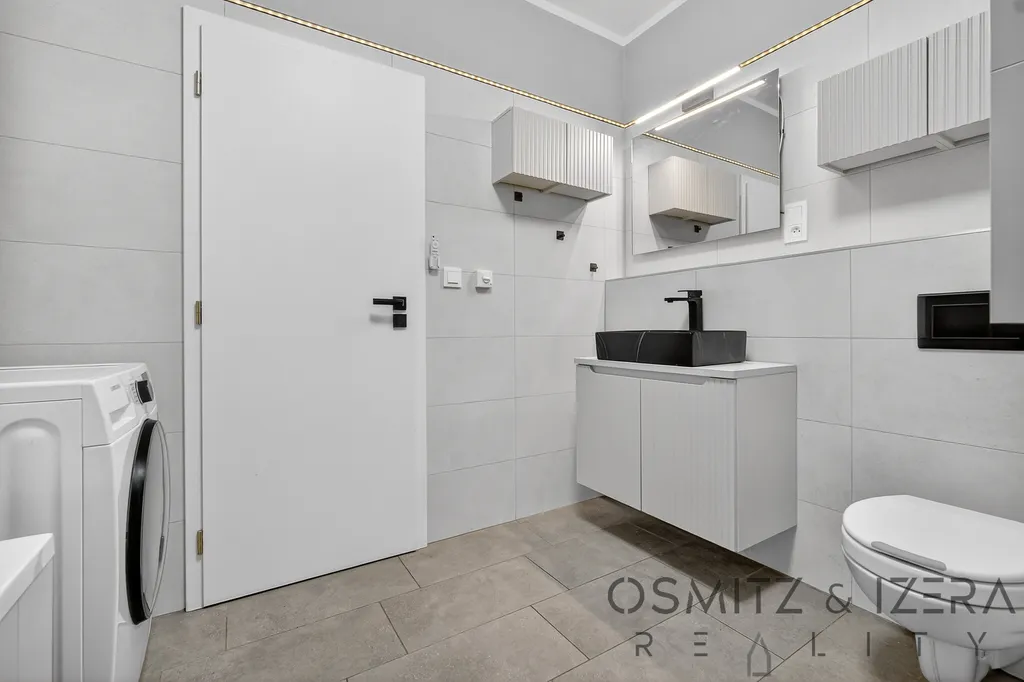 • Koupelna: Vana, závěsné WC, černé keramické umyvadlo, pračka se sušičkou a topný žebřík.