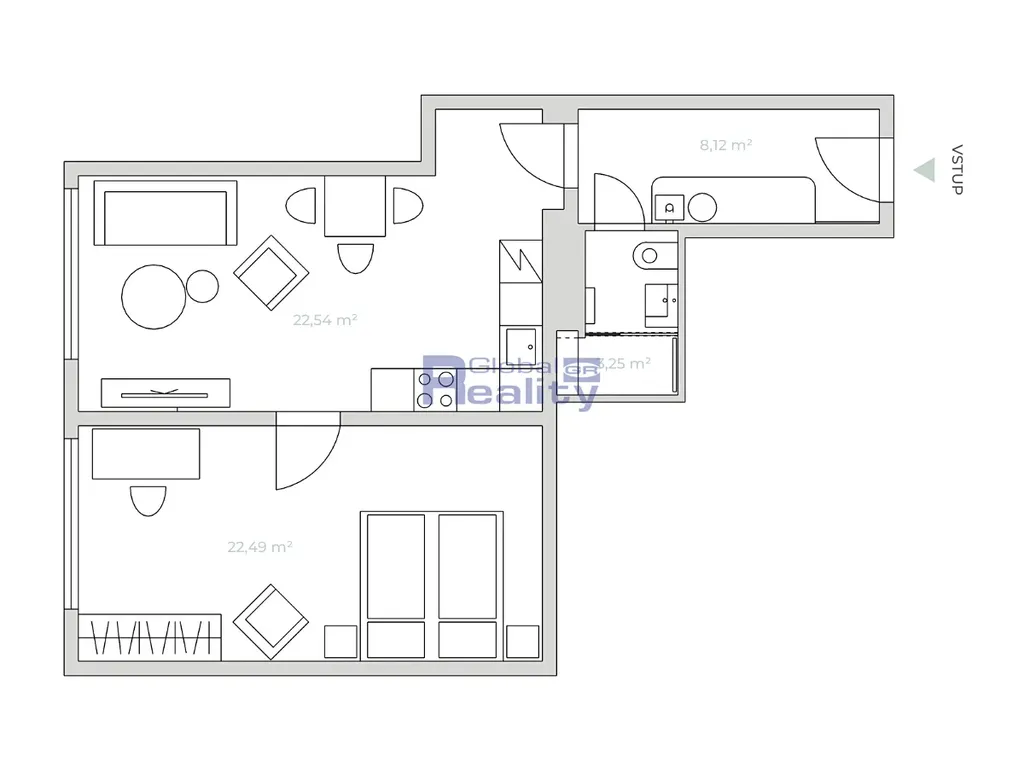 Dispozice bytu: vstupní chodba, prostorný obývací pokoj s kuchyňským koutem, ložnice, koupelna a WC. Byt je vybaven kuchyňskou linkou včetně elektrospotřebičů.