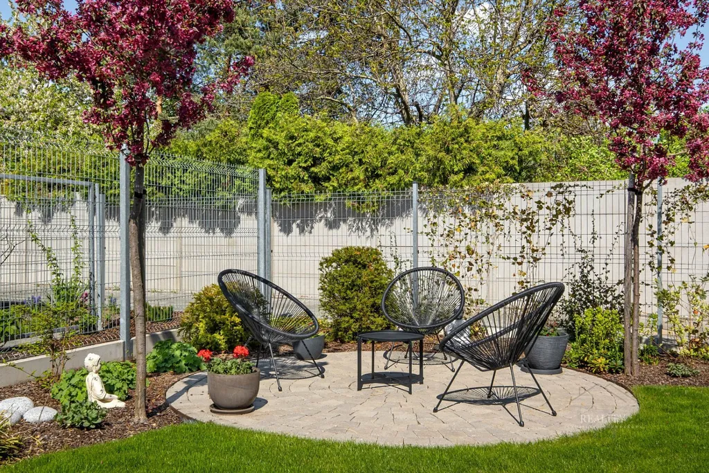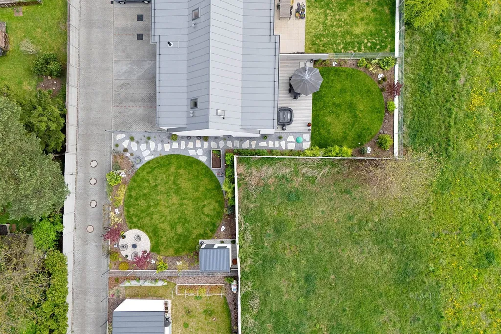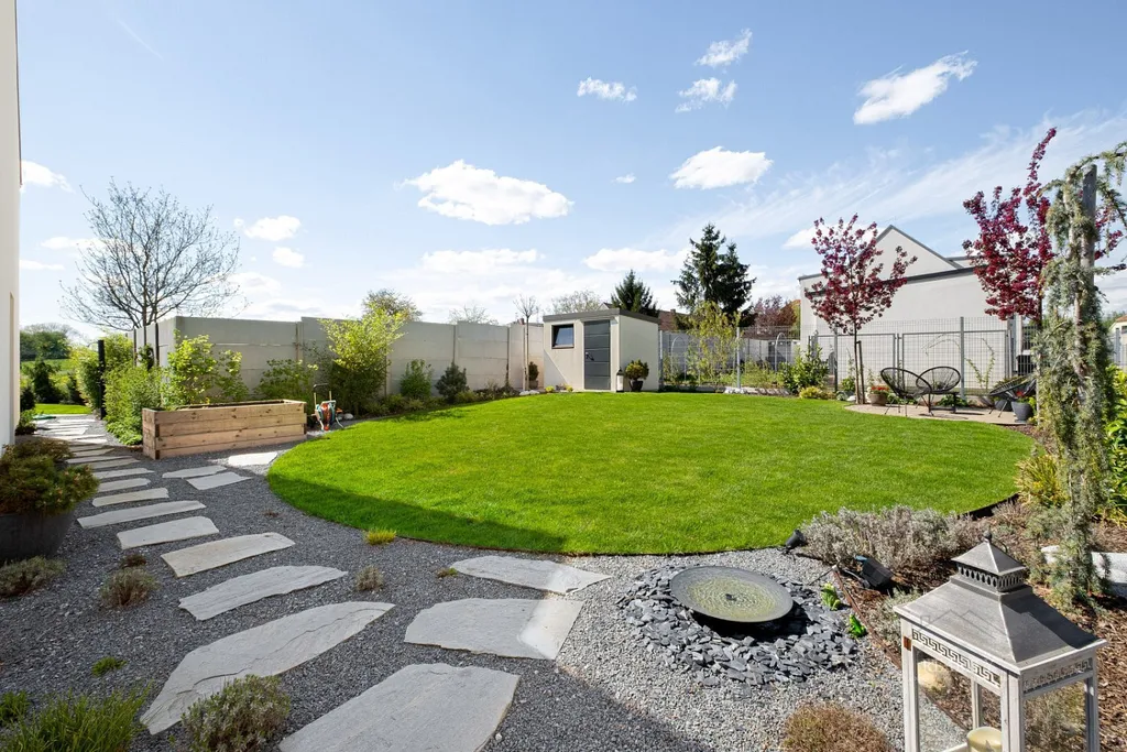Pečlivě upravená zahrada byla realizována dle návrhu zahradního architekta a nabízí ideální kombinaci estetiky a funkčnosti.