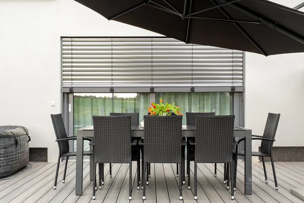 Celý dům je osazen izolačními trojskly a předokenními roletami na dálkové ovládání.