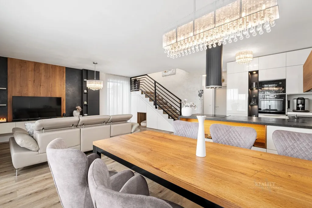 Dominantou přízemí je prostorný obytný prostor s plynulým propojením kuchyňské, jídelní a obývací části. Luxusní kuchyňská linka značky Sykora byla navržena na míru a je vybavena prémiovými vestavěnými spotřebiči.