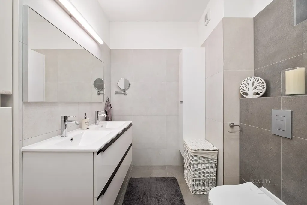 V přízemí se dále nachází koupelna se sprchovým koutem a samostatné WC, řešené v moderním a nadčasovém stylu.